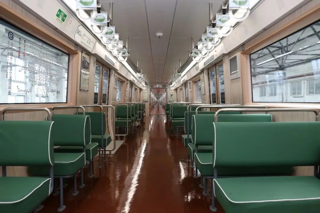 這列行駛在北京地鐵1號(hào)線的網(wǎng)紅地鐵 每一節(jié)車(chē)廂都代表著 一個(gè)年代的地鐵風(fēng)格 列車(chē)第一節(jié)車(chē)廂的布局 就是新中國(guó)第一輛地鐵客車(chē)的樣子