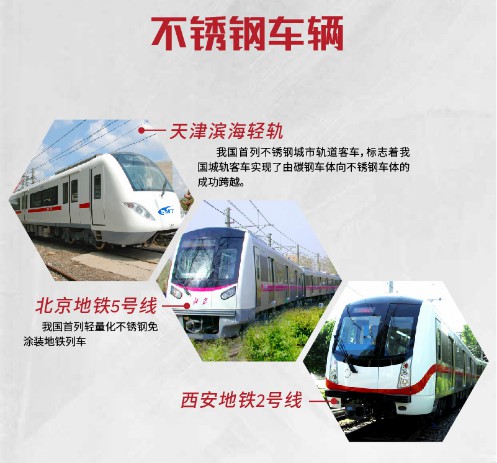 首列不銹鋼城軌客車(chē),標(biāo)志著我國(guó)城軌客車(chē)實(shí)現(xiàn)了由碳鋼車(chē)體向不銹鋼車(chē)體的成功跨越。 首列跨座式單軌車(chē),標(biāo)志著我國(guó)成為世界上繼日本之后少數(shù)幾個(gè)擁有此種大型車(chē)輛制造技術(shù)的國(guó)家。 為北京地鐵5號(hào)線生產(chǎn)的首列不銹鋼免涂裝地鐵車(chē),是我國(guó)第一個(gè)批量設(shè)計(jì)、生產(chǎn)的輕量化不銹鋼免涂裝地鐵客車(chē)項(xiàng)目,標(biāo)志著我國(guó)的不銹鋼車(chē)體制造技術(shù)達(dá)到了世界一流水平。