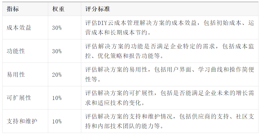 以上是對(duì)DIY云成本管理的概述,以及相關(guān)建議和綜合指標(biāo)體系評(píng)價(jià)表模板。通過(guò)綜合評(píng)估和實(shí)施有效的云成本管理策略,企業(yè)可以實(shí)現(xiàn)更好的云成本優(yōu)化?!?/span>