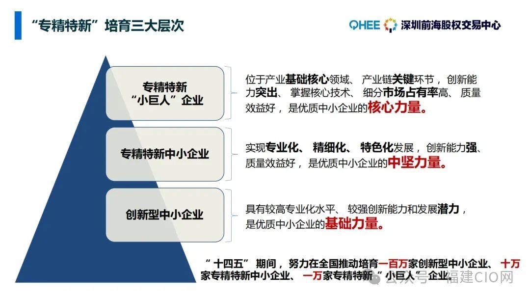 根據(jù)最新的梯度培育辦法,“專精特新”分為三個(gè)層次,從下往上,呈金字塔結(jié)構(gòu):基礎(chǔ)的是創(chuàng)新型的中小企業(yè),主要是指具有較高的專業(yè)化水平、較強(qiáng)的創(chuàng)新能力和發(fā)展?jié)摿Φ钠髽I(yè);把目前的省級(jí)和市級(jí)的“專精特新”資質(zhì)認(rèn)定合并,形成現(xiàn)在的第二層,也是梯度培育里面的中堅(jiān)力量;而第三層“專精特新”小巨人是核心,整個(gè)國(guó)家不超過1萬家企業(yè)成為“專精特新”小巨人企業(yè)。從整個(gè)國(guó)家層面來講,計(jì)劃在十四五期間,在全國(guó)推動(dòng)培育100萬家創(chuàng)新型中小企業(yè),10萬家“專精特新”中小企業(yè),1萬家“專精特新”小巨人企業(yè)。