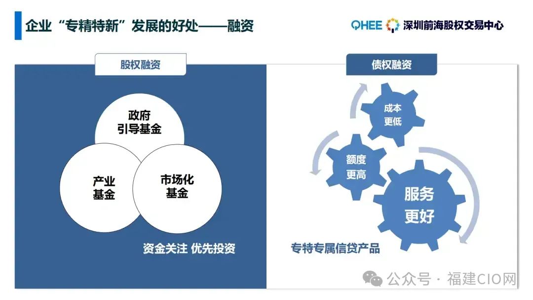 首先,能有機(jī)會(huì)獲得政府大量的現(xiàn)金資助,各級(jí)政府都有相應(yīng)的補(bǔ)助鼓勵(lì)政策。其次,資本市場(chǎng)的資源更愿意向“專精特新”企業(yè)傾斜。從股權(quán)融資角度來看,目前一級(jí)市場(chǎng)的資金方多帶有政府性質(zhì),這些資金都非常關(guān)注“專精特新”企業(yè),有相應(yīng)的優(yōu)先投資政策,甚至有明確指標(biāo)。債券融資方面,現(xiàn)在各大銀行,比如浦發(fā)銀行,都有“專精特新”企業(yè)專屬信貸產(chǎn)品,為企業(yè)提供成本更低、額度更高、服務(wù)流程更好的融資產(chǎn)品。除此之外,針對(duì)“專精特新”企業(yè)的境外發(fā)債也有特殊的外匯通路。