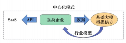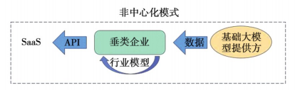 2)非中心化模式。在這一模式下,大模型提供方會(huì)將訓(xùn)練后的模型提供給垂直行業(yè)的企業(yè),如圖2所示。企業(yè)可以在此基礎(chǔ)上根據(jù)具體的業(yè)務(wù)場(chǎng)景和專有數(shù)據(jù)對(duì)模型進(jìn)行微調(diào).采用自我微調(diào)、有監(jiān)督微調(diào)、指令調(diào)整等方式形成行業(yè)大模型或多個(gè)業(yè)務(wù)小模型。這種方式雖然避免了數(shù)據(jù)泄露的風(fēng)險(xiǎn),但對(duì)企業(yè)自身的技術(shù)能力有較高的要求。同時(shí),預(yù)訓(xùn)練由基礎(chǔ)大模型提供方完成,而微調(diào)由企業(yè)完成,兩者之問提供的數(shù)據(jù)可能存在矛盾。