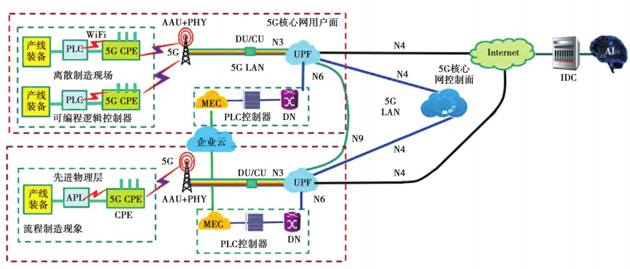 通過修改5G核心網(wǎng)的用戶數(shù)據(jù)庫(UDM),可以設(shè)定特定的一組終端,形成5G LAN,提供本地L2包(數(shù)據(jù)鏈路層的包,即第2層的包)轉(zhuǎn)發(fā)能力,以實(shí)現(xiàn)對(duì)WiFi更好的覆蓋和業(yè)務(wù)隔離。因此,企業(yè)僅需配備5G CPE,通過UPF下沉和IPv6上云(公有云、企業(yè)云、混合云或多云),就可以無需自建T業(yè)互聯(lián)網(wǎng)平臺(tái)及企業(yè)大腦,實(shí)現(xiàn)大數(shù)據(jù)分析與AI決策能力,有助于推動(dòng)數(shù)字化轉(zhuǎn)型。