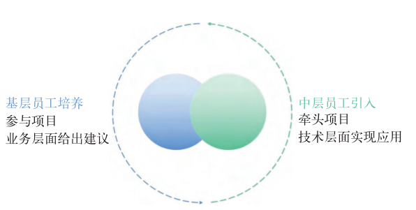基于近幾年我院對將近 400 家中小企業(yè)診斷數(shù)據(jù)中發(fā)現(xiàn),中小企業(yè)的基層員工中,本地員工占比能達(dá)到90%,企業(yè)歸屬感和忠誠度較高,這些員工具有豐富的操作經(jīng)驗和設(shè)備維修經(jīng)驗。與此同時掌握數(shù)字化新興技術(shù)的中層人員流動頻繁,人員缺失情況比較嚴(yán)重。員工能力提升兩個對象如圖 4 所示。所以中小企業(yè)首先應(yīng)注重基層員工的培養(yǎng),加強(qiáng)員工的綜合培訓(xùn),因為數(shù)字化轉(zhuǎn)型需要既懂業(yè)務(wù)又懂技術(shù)的綜合性人才,鼓勵基層員工積極參與信息化項目,從具體業(yè)務(wù)需求層面提出寶貴建議。