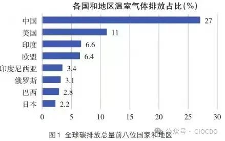 根據(jù)國際非營利組織EMBER的統(tǒng)計,中國、美國、印度仍然處于全球碳排放總量前三位,中國在2019年碳排放量占到了全球總量的27%,美國以11%的排放量排名第二,印度以6.6%的排放量排名第三。全球碳排放總量前八位國家和地區(qū)見圖1。