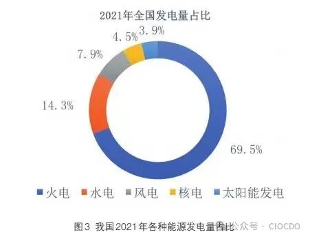2021年,我國原煤、原油、天然氣等化石能源生產(chǎn)量占能源生產(chǎn)總量的比重約83%,能源結(jié)構(gòu)仍以化石能源為主;總發(fā)電量中火電占69.5%,水電占14.3%,核電占4.5%,風電占7.9%,太陽能發(fā)電占3.9%,見圖3我國2021年各種能源發(fā)電量占比,可見我國企業(yè)實現(xiàn)碳中和難度之大。