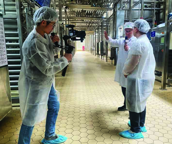 圖為蒙牛曲靖工廠負(fù)責(zé)人馬福利向記者介紹如何通過優(yōu)化車間設(shè)計(jì),削減生產(chǎn)能耗