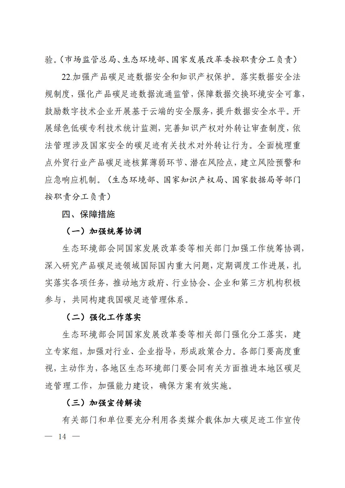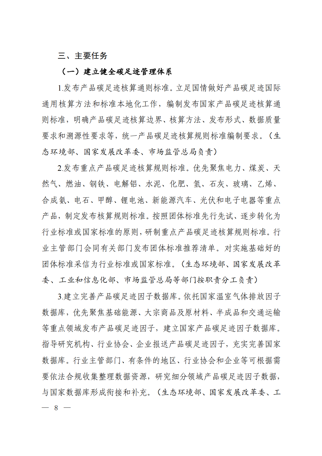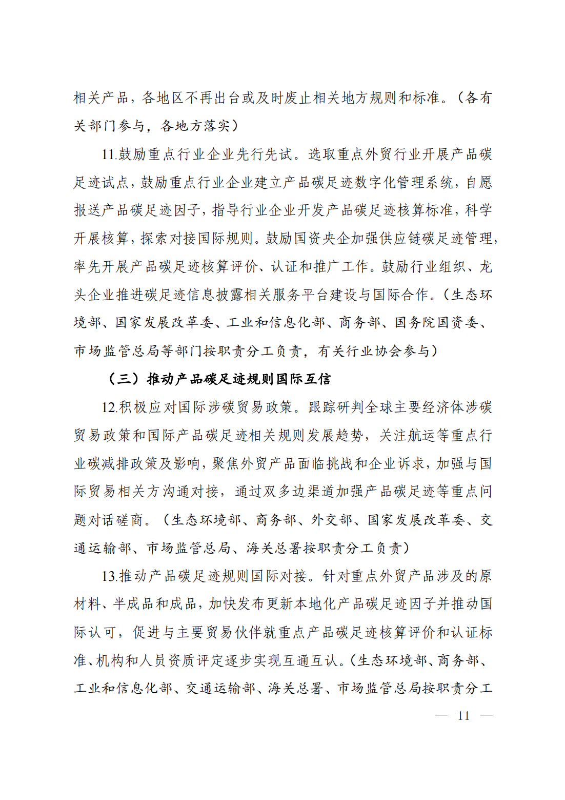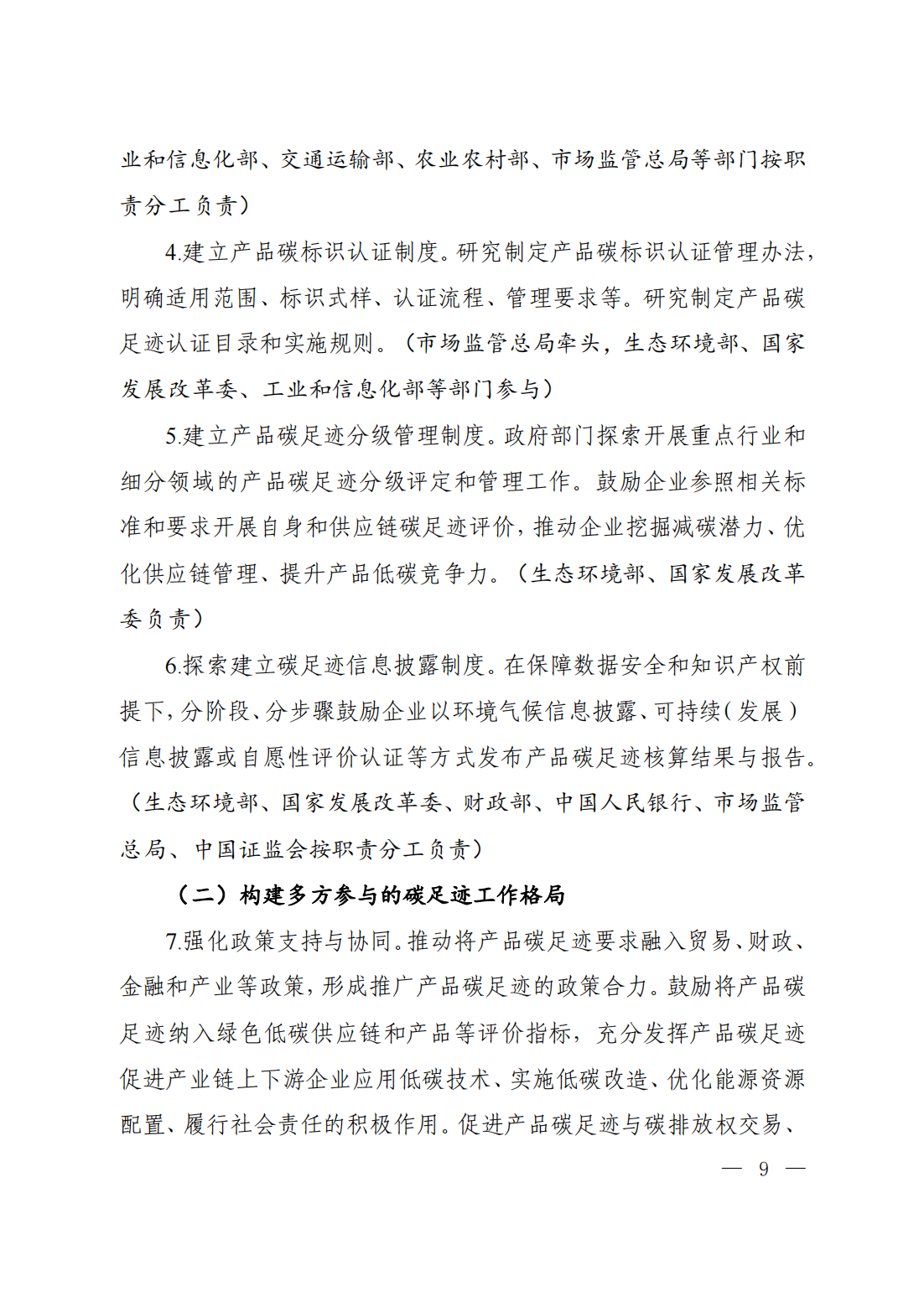 通知原文如下 關(guān)于印發(fā)《關(guān)于建立碳足跡管理體系的實(shí)施方案》的通知 環(huán)氣候〔2024〕30號 各省、自治區(qū)、直轄市及新疆生產(chǎn)建設(shè)兵團(tuán)生態(tài)環(huán)境廳(局)、發(fā)展改革委、工業(yè)和信息化主管部門、財(cái)政廳(局)、人力資源社會保障廳(局)、住房城鄉(xiāng)建設(shè)廳(委、管委、局)、交通運(yùn)輸廳(局、委)、商務(wù)主管部門、國資委、市場監(jiān)管局(廳、委)、數(shù)據(jù)管理部門;中國人民銀行上海總部,各省、自治區(qū)、直轄市及計(jì)劃單列市分行;海關(guān)總署廣東分署、各直屬海關(guān);國家金融監(jiān)督管理總局各監(jiān)管局;中國證券監(jiān)督管理委員會各證監(jiān)局: 為深入貫徹落實(shí)《中共中央 國務(wù)院關(guān)于全面推進(jìn)美麗中國建設(shè)的意見》《中共中央 國務(wù)院關(guān)于完整準(zhǔn)確全面貫徹新發(fā)展理念做好碳達(dá)峰碳中和工作的意見》和《2030年前碳達(dá)峰行動方案》部署要求,加快建立碳足跡管理體系,形成綠色低碳供應(yīng)鏈和生產(chǎn)生活方式,推動新質(zhì)生產(chǎn)力發(fā)展,助力實(shí)現(xiàn)碳達(dá)峰碳中和目標(biāo),生態(tài)環(huán)境部會同國家發(fā)展改革委、工業(yè)和信息化部、財(cái)政部、人力資源社會保障部、住房城鄉(xiāng)建設(shè)部、交通運(yùn)輸部、商務(wù)部、中國人民銀行、國務(wù)院國資委、海關(guān)總署、市場監(jiān)管總局、金融監(jiān)管總局、中國證監(jiān)會、國家數(shù)據(jù)局制定了《關(guān)于建立碳足跡管理體系的實(shí)施方案》?,F(xiàn)印發(fā)給你們,請認(rèn)真抓好落實(shí)。 附件下載: 生態(tài)環(huán)境部 國家發(fā)展改革委 工業(yè)和信息化部 財(cái)政部 人力資源社會保障部 住房城鄉(xiāng)建設(shè)部 交通運(yùn)輸部 商務(wù)部 中國人民銀行 國務(wù)院國資委 海關(guān)總署 市場監(jiān)管總局 金融監(jiān)管總局 中國證監(jiān)會 國家數(shù)據(jù)局 2024年5月22日