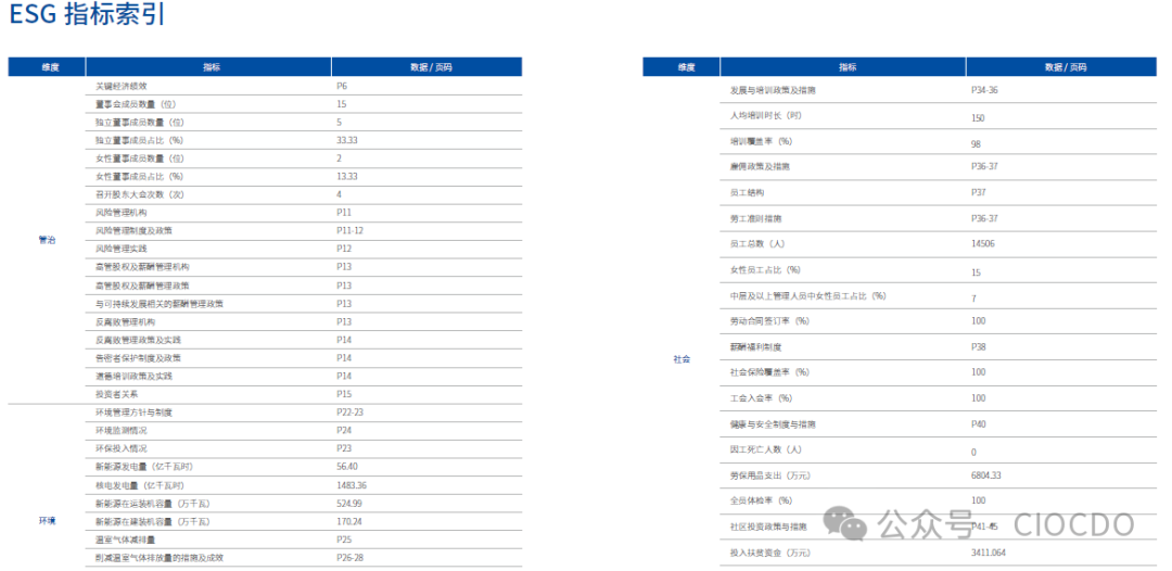 中國(guó)核電ESG報(bào)告以一張圖形式披露公司連續(xù)幾年的主要經(jīng)營(yíng)數(shù)據(jù),為公眾了解公司管理運(yùn)營(yíng)成效提供對(duì)比數(shù)據(jù);正文重點(diǎn)數(shù)據(jù)突出顯示,并通過(guò)ESG關(guān)鍵指標(biāo)索引集中回應(yīng)ESG數(shù)據(jù)披露要求,向利益相關(guān)方直觀展現(xiàn)履責(zé)績(jī)效,清晰明了。