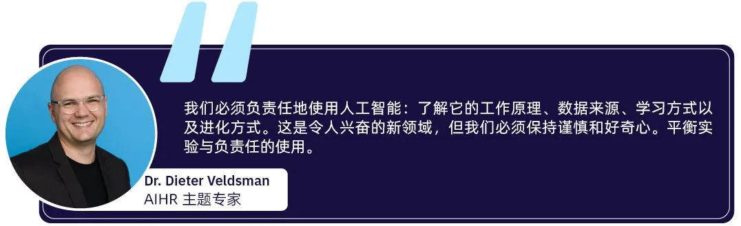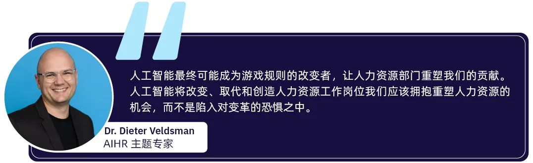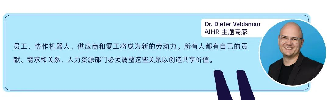 人工智能在人力資源領(lǐng)域的未來不僅具有重大前景,而且在人力資源行業(yè)內(nèi)也帶來了變革。隨著人工智能繼續(xù)重塑人力資源專業(yè)人員的運(yùn)作方式,他們必須開發(fā)新技能以保持相關(guān)性并推動(dòng)業(yè)務(wù)價(jià)值。以下是人力資源專業(yè)人員需要發(fā)揮的一些關(guān)鍵作用及其對(duì)人力資源專業(yè)的影響。 1、HR在人工智能應(yīng)用中的作用 人工智能不僅將在整個(gè)員工生命周期中無處不在,而且還將成為人力資源部門需要管理的員工隊(duì)伍的一部分。目前,勞動(dòng)力由從事工作的傳統(tǒng)員工、零工、供應(yīng)商或承包商組成。未來,人力資源部門還需要管理與員工合作的協(xié)作機(jī)器人以完成工作。 未來,生成式人工智能將能夠?qū)μ囟ㄈ蝿?wù)和活動(dòng)承擔(dān)全部責(zé)任。這將影響工作設(shè)計(jì)以及人力資源部門未來如何制定能力規(guī)劃。 為了管理未來的勞動(dòng)力,Veldsman 博士預(yù)測(cè),人力資源專業(yè)人員將需要: 了解 AI 機(jī)器人帶來的價(jià)值 確定如何將這些機(jī)器人納入未來的勞動(dòng)力計(jì)劃 2、HR的角色將發(fā)生變化 人工智能不僅將在整個(gè)員工生命周期中無處不在,而且還將成為人力資源部門需要管理的員工隊(duì)伍的一部分。目前,勞動(dòng)力由從事工作的傳統(tǒng)員工、零工、供應(yīng)商或承包商組成。未來,人力資源部門還需要管理與員工合作的協(xié)作機(jī)器人以完成工作。 未來,人力資源從業(yè)人員的工作也將發(fā)生變化。隨著人工智能消除了大部分重復(fù)的運(yùn)營工作,人力資源部門將把重點(diǎn)轉(zhuǎn)移到支持整個(gè)組織采用人工智能,并為企業(yè)提供更多的戰(zhàn)略價(jià)值。人力資源專業(yè)人員將需要發(fā)展新技能來適應(yīng)這種變化。 人力資源從業(yè)者需要培養(yǎng)的其他技能包括: 商業(yè)頭腦:真正了解業(yè)務(wù)是使 HR 解決方案與業(yè)務(wù)需求保持一致的起點(diǎn)。 溝通技巧:?與各種人建立良好聯(lián)系并留下專業(yè)和積極印象的能力對(duì)于人力資源專業(yè)人員來說至關(guān)重要。 通過技術(shù)交付:能夠有效地將技術(shù)實(shí)施到 HR 解決方案中,以提高效率、規(guī)模和業(yè)務(wù)影響。 積極傾聽:積極傾聽與同理心齊頭并進(jìn),同理心是從所有利益相關(guān)者的角度看待情況的能力。在整個(gè)企業(yè)中應(yīng)用人工智能時(shí)的一項(xiàng)重要技能。 生成式 AI:能夠?qū)?AI 集成到他們的日常活動(dòng)中,并了解如何使用負(fù)責(zé)相鄰任務(wù)的 AI 技術(shù)。 解決問題的能力:在數(shù)字化的員工隊(duì)伍中尋找新的解決方案,幫助企業(yè)在市場(chǎng)上取勝。 好奇心:不斷提出問題,保持開放的心態(tài),想要學(xué)習(xí)和保持好奇心。 3、推動(dòng)負(fù)責(zé)人的AI應(yīng)用 無論是現(xiàn)在還是將來,人力資源部門都需要成為整個(gè)組織負(fù)責(zé)任地使用人工智能的守門人。Dieter Veldsman 博士建議,人力資源從業(yè)者可以通過多種方式為負(fù)責(zé)任地應(yīng)用 AI 做出貢獻(xiàn): 了解數(shù)據(jù)的來源 組建一個(gè)任務(wù)團(tuán)隊(duì)來制定規(guī)則和指南 嘗試其使用方法,但以逐步推進(jìn)的方式進(jìn)行 建立對(duì)技術(shù)的信任和透明度,但要注意其局限性 為關(guān)于人工智能未來的更大討論做出貢獻(xiàn) ★關(guān)鍵要點(diǎn)★ 人工智能在人力資源中的應(yīng)用正在迅速增長。幾乎每個(gè)人力資源領(lǐng)域都有 AI 驅(qū)動(dòng)的解決方案。為了充分利用這項(xiàng)技術(shù)并推動(dòng)人工智能在組織內(nèi)的應(yīng)用,人力資源從業(yè)者需要提高他們的技能,并圍繞負(fù)責(zé)任地使用人工智能構(gòu)建最佳實(shí)踐。 來源:https://www.aihr.com/blog/ai-in-hr/