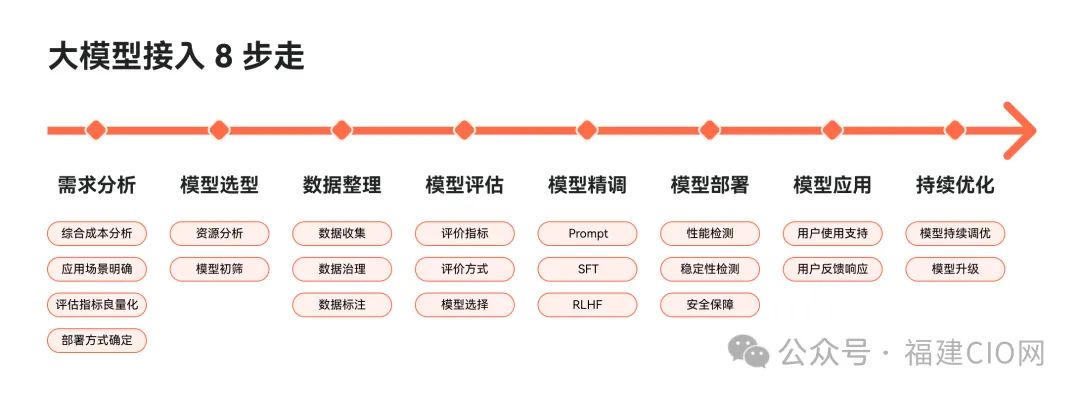 優(yōu)秀的企業(yè)現(xiàn)在就該著手做好全方位的戰(zhàn)略準備,經(jīng)過觀察梳理,《白皮書》建議企業(yè)在實施生成式AI項目時采取結(jié)構(gòu)化和流程化的方法,分為八個步驟系統(tǒng)性地接入大模型。