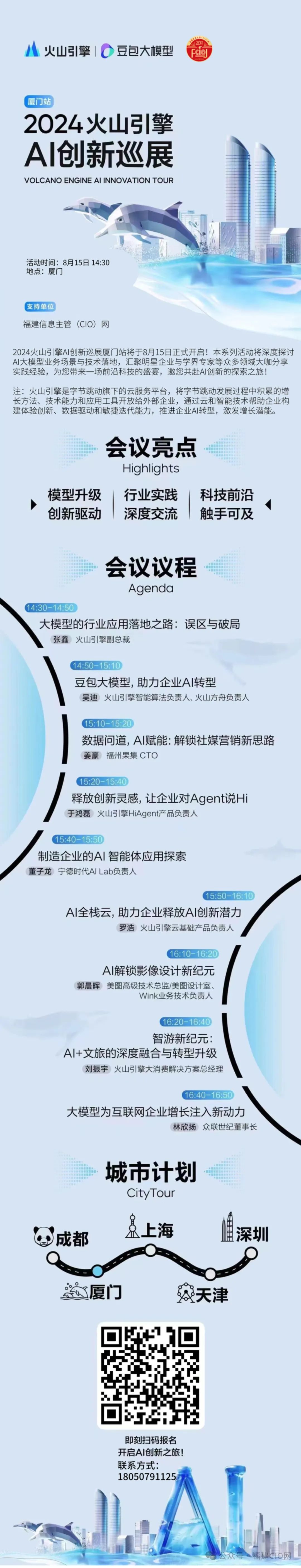 解鎖AI時代的競爭優(yōu)勢,從不確定中找到確定!2024年8月15日,福建信息主管(CIO)網(wǎng)與福建省數(shù)字經(jīng)濟促進會攜手火山引擎,帶來AI創(chuàng)新巡展(廈門站)。?匯聚行業(yè)領(lǐng)袖,共同探討大模型AI在制造、互聯(lián)網(wǎng)、文旅等領(lǐng)域的應(yīng)用。通過專家分享與實戰(zhàn)案例,精準鎖定最適合您企業(yè)的AI解決方案,讓您的企業(yè)在數(shù)字化轉(zhuǎn)型中拔得頭籌!請根據(jù)文末海報二維碼立即報名,開啟通往成功的征程!