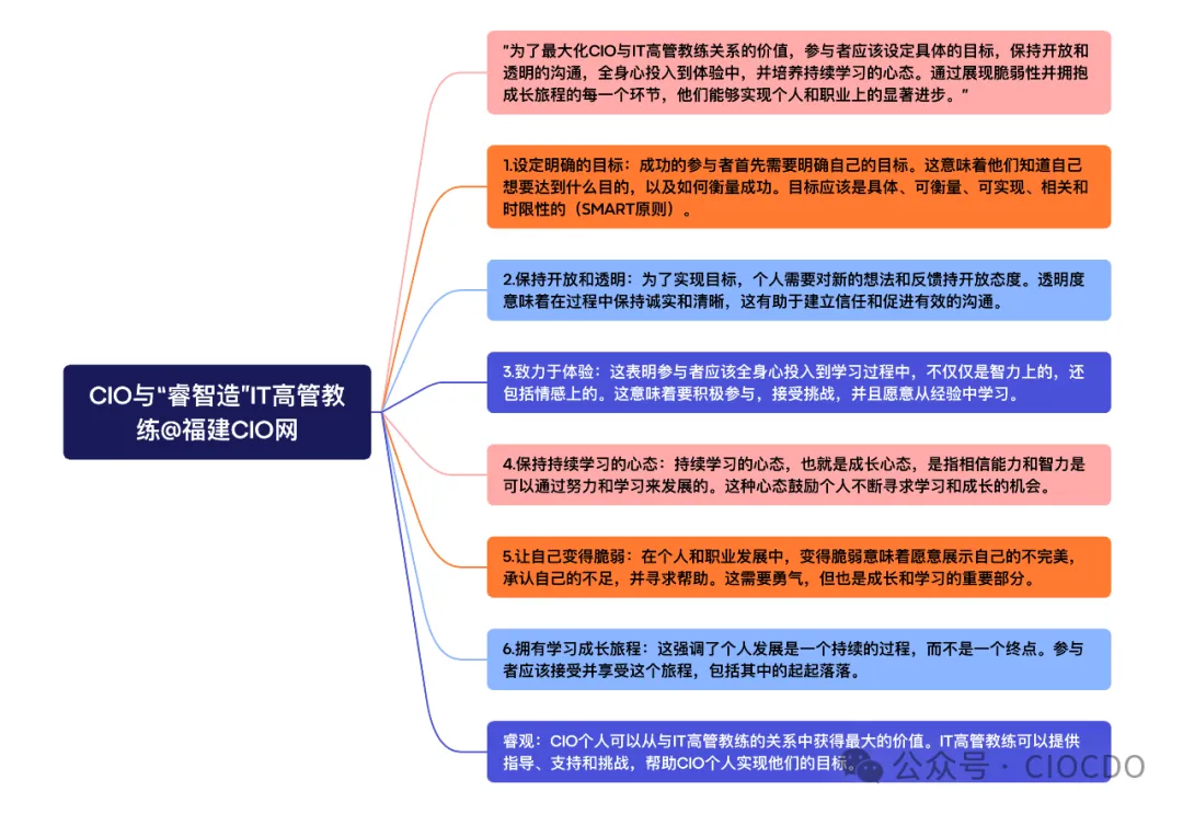 “為了最大化CIO與IT高管教練關(guān)系的價(jià)值,參與者應(yīng)該設(shè)定具體的目標(biāo),保持開放和透明的溝通,全身心投入到體驗(yàn)中,并培養(yǎng)持續(xù)學(xué)習(xí)的心態(tài)。通過展現(xiàn)脆弱性并擁抱成長旅程的每一個(gè)環(huán)節(jié),他們能夠?qū)崿F(xiàn)個(gè)人和職業(yè)上的顯著進(jìn)步。”