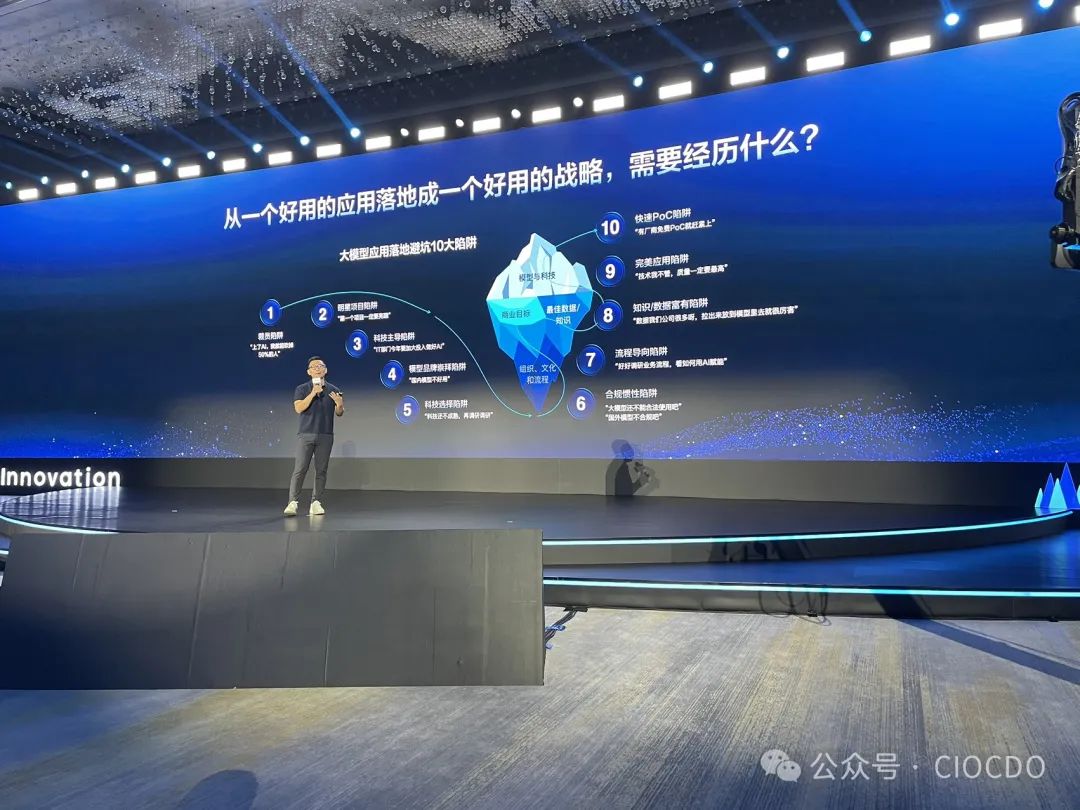 那如何從一個單點局部的應(yīng)用變成能夠賦能整個公司業(yè)務(wù)發(fā)展的一個策略,經(jīng)過我們和上百家企業(yè)的實踐,除了模型和科技之外,其實還存在著很多組織流程優(yōu)化,包括商業(yè)模式上的調(diào)整。比如說這里我們就總結(jié)了我們和企業(yè)調(diào)研下來,發(fā)現(xiàn)大家常會有的十大誤區(qū)。比如說我這個AI項目的價值怎么衡量,是不是我能裁掉30%的人等等。(詳見下圖)