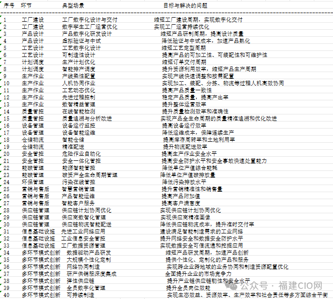 智能制造典型場(chǎng)景是智能工廠的基本組成單元,面向產(chǎn)品全生命周期、生產(chǎn)制造全過(guò)程和供應(yīng)鏈全環(huán)節(jié)核心問(wèn)題,通過(guò)新一代信息技術(shù)與先進(jìn)制造技術(shù)的深度融合,部署智能制造裝備、工業(yè)軟件和系統(tǒng),實(shí)現(xiàn)具備協(xié)同和自治特征、具有特定功能和實(shí)際價(jià)值的應(yīng)用。根據(jù)十余年來(lái)我國(guó)智能制造 探索實(shí)踐,結(jié)合技術(shù)創(chuàng)新和融合應(yīng)用發(fā)展趨勢(shì),凝練總結(jié)了 15 個(gè)環(huán)節(jié)的 40 個(gè)智能制造典型場(chǎng)景,作為智能工廠梯度培育、智能制造系統(tǒng)解決方案“揭榜掛帥”、智能制造標(biāo)準(zhǔn)體系建設(shè)等工作的參考指引。