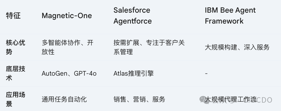Magnetic-One(是由微軟研究團(tuán)隊(duì)開(kāi)發(fā)的一種新型多智能體系統(tǒng),旨在通過(guò)多個(gè)智能體的協(xié)同工作來(lái)提升個(gè)人和企業(yè)的工作效率。該系統(tǒng)允許一個(gè)AI模型驅(qū)動(dòng)多個(gè)助手智能體,共同完成復(fù)雜的多步驟任務(wù)。)是Salesforce(創(chuàng)建于1999年3月的一家客戶關(guān)系管理/CRM軟件服務(wù)提供商,總部設(shè)于美國(guó)舊金山,可提供隨需應(yīng)用的客戶關(guān)系管理平臺(tái))的Agentforce(是由Salesforce推出的一套開(kāi)創(chuàng)性的自主AI代理套件,旨在增強(qiáng)員工能力并處理服務(wù)、銷售、營(yíng)銷和商務(wù)中的任務(wù),從而提高工作效率和客戶滿意度。其通過(guò)幾次點(diǎn)擊即可按需擴(kuò)展員工隊(duì)伍,其無(wú)限數(shù)字AI代理團(tuán)隊(duì)可以分析數(shù)據(jù)、做出決策,并在回答客戶服務(wù)咨詢、確定銷售線索和優(yōu)化營(yíng)銷活動(dòng)等任務(wù)上采取行動(dòng)。)或IBM(國(guó)際商業(yè)機(jī)器公司或萬(wàn)國(guó)商業(yè)機(jī)器公司,總公司在紐約州阿蒙克市。IT公司-國(guó)際商業(yè)機(jī)器公司。1911年托馬斯·約翰·沃森創(chuàng)立于美國(guó),是全球最大的信息技術(shù)和業(yè)務(wù)解決方案公司,擁有全球雇員 31萬(wàn)多人,業(yè)務(wù)遍及160多個(gè)國(guó)家和地區(qū)。)的Bee Agent Framework(是一個(gè)由IBM開(kāi)發(fā)人員發(fā)布的開(kāi)源框架,主要用于大規(guī)模構(gòu)建、深入和服務(wù)代理工作流程。)等multi-agent frameworks(多智能體框架,?是一種將復(fù)雜的系統(tǒng)分解為多個(gè)獨(dú)立的智能體,這些智能體通過(guò)相互通信和協(xié)作來(lái)共同完成復(fù)雜任務(wù)的系統(tǒng)架構(gòu)。每個(gè)智能體具有獨(dú)立的目標(biāo)和行為,通過(guò)競(jìng)爭(zhēng)和磋商等手段解決相互之間的矛盾和沖突,從而實(shí)現(xiàn)系統(tǒng)的整體目標(biāo)。)的競(jìng)爭(zhēng)對(duì)手,它們都面向希望讓AI完成目前由人類處理的復(fù)雜任務(wù)的企業(yè)。