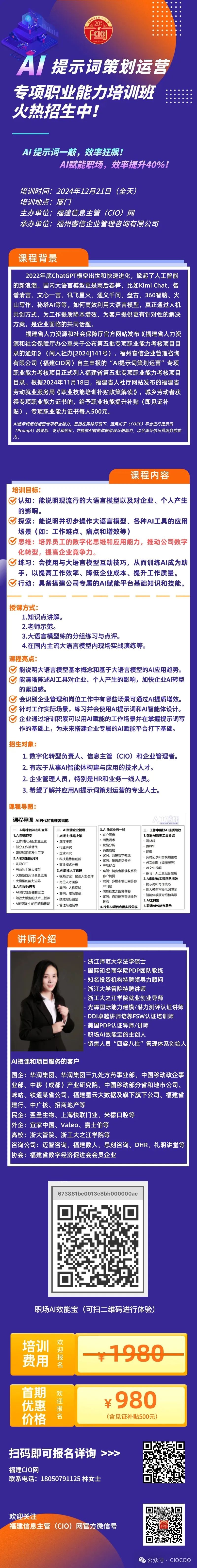 【培訓(xùn)背景:在人工智能浪潮蓬勃興起的背景下,2024 年 9 月 12 日,福建省人力資源和社會(huì)保障廳官方網(wǎng)站發(fā)布《福建省人力資源和社會(huì)保障廳辦公室關(guān)于公布第五批專(zhuān)項(xiàng)職業(yè)能力考核項(xiàng)目目錄的通知》(閩人社辦 [2024] 141 號(hào)),福州睿信企業(yè)管理咨詢(xún)有限公司(福建 CIO 網(wǎng))自主申報(bào)的 “AI 提示詞策劃運(yùn)營(yíng)” 專(zhuān)項(xiàng)職業(yè)能力考核項(xiàng)目正式列入福建省第五批專(zhuān)項(xiàng)職業(yè)能力考核項(xiàng)目目錄?!?/strong>