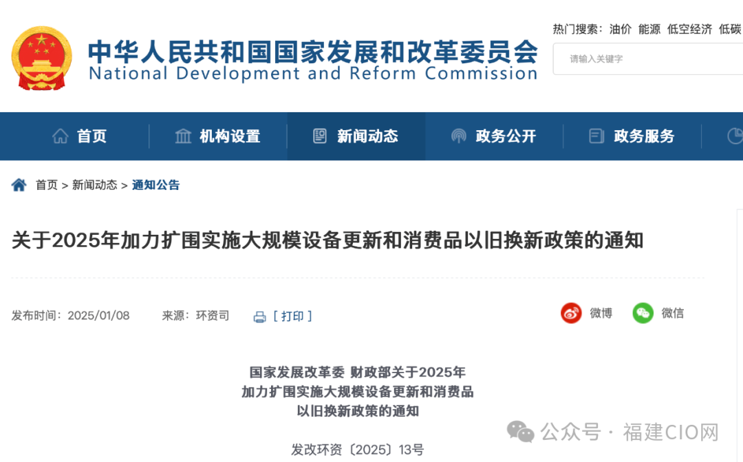 ??為全面貫徹黨的二十大和二十屆二中、三中全會精神,認真落實中央經(jīng)濟工作會議部署,根據(jù)《推動大規(guī)模設(shè)備更新和消費品以舊換新行動方案》(國發(fā)〔2024〕7號),經(jīng)國務(wù)院同意,現(xiàn)將2025年加力擴圍實施大規(guī)模設(shè)備更新和消費品以舊換新政策通知如下。