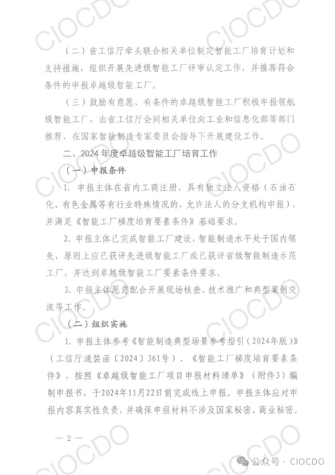 (二)省工信廳牽頭聯(lián)合相關(guān)單位制定智能工廠培育計(jì)劃和支持措施,組織開(kāi)展先進(jìn)級(jí)智能工廠評(píng)審認(rèn)定工作,并推薦符合條件的申報(bào)卓越級(jí)智能工廠。