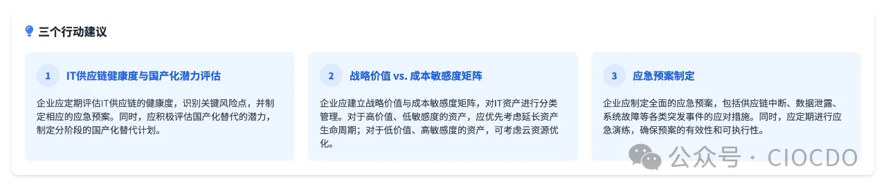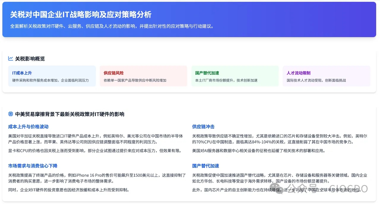 【睿觀:關(guān)稅同樣對中國企業(yè)IT戰(zhàn)略構(gòu)成了嚴(yán)峻挑戰(zhàn),但也提供了重新審視成本結(jié)構(gòu)、優(yōu)化供應(yīng)鏈、加速本土化和聚焦戰(zhàn)略重點(diǎn)的契機(jī)。CIO需要從被動應(yīng)對轉(zhuǎn)向主動管理,通過精準(zhǔn)的評估、戰(zhàn)略性的規(guī)劃和靈活的執(zhí)行,駕馭不確定性,確保IT能夠持續(xù)支撐甚至引領(lǐng)企業(yè)在復(fù)雜環(huán)境中發(fā)展?!?/strong>