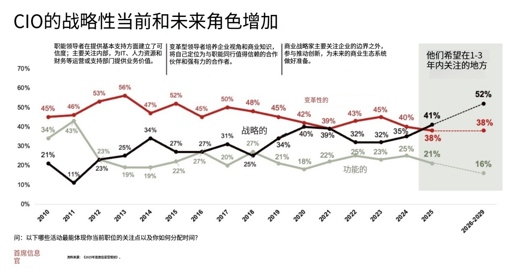 CIO.com第24年的2025年首席信息官現(xiàn)狀研究,調(diào)查了906名信息技術(shù)領(lǐng)導(dǎo)者和250名部門業(yè)務(wù)專業(yè)人士,證實(shí)IT領(lǐng)導(dǎo)者們今年正在加大戰(zhàn)略重點(diǎn),部分目的是將早期的人工智能實(shí)驗(yàn)轉(zhuǎn)化為能夠帶來可衡量業(yè)務(wù)成果的舉措。在本次調(diào)查中,41%的IT領(lǐng)導(dǎo)者受訪者將其角色描述為戰(zhàn)略性的,而2024年這一比例僅為35%。今年超過一半(52%)的受訪者預(yù)計(jì)未來三到五年他們將繼續(xù)保持戰(zhàn)略取向。相比之下,32%的IT領(lǐng)導(dǎo)者預(yù)計(jì)在同一時(shí)間段內(nèi)將轉(zhuǎn)向更多轉(zhuǎn)型性工作,僅有16%的人預(yù)計(jì)會(huì)花大量時(shí)間在更傳統(tǒng)且非戰(zhàn)略性的IT職責(zé)上。?