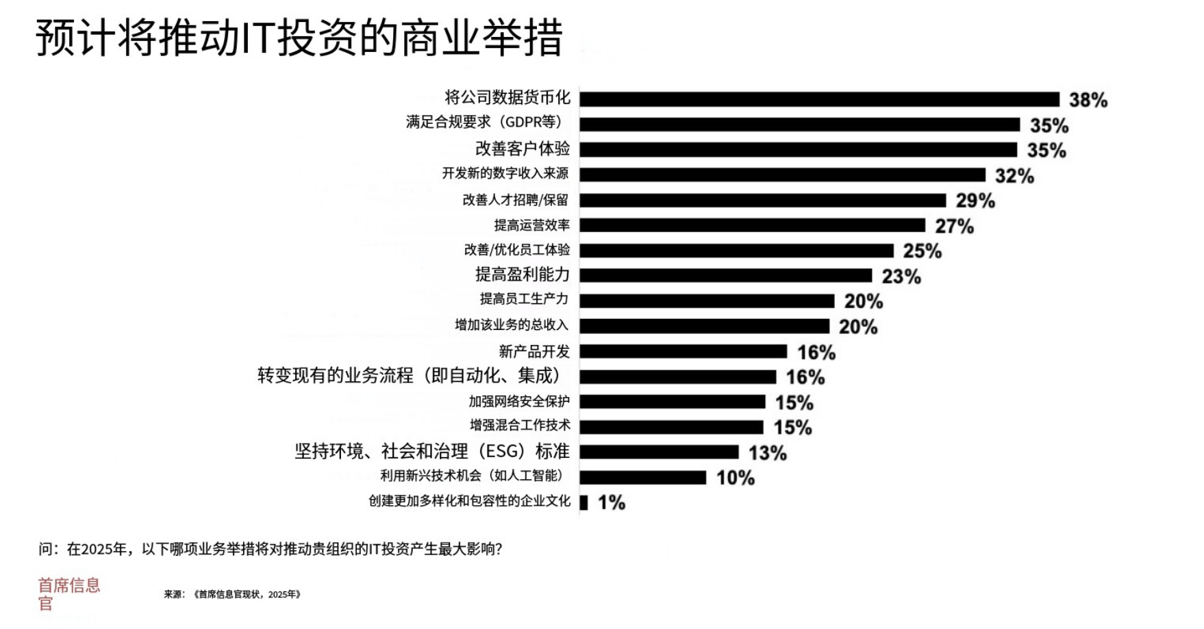 盡管人工智能/機(jī)器學(xué)習(xí)無疑是2025年最突出的議程項(xiàng)目,但還有許多其他技術(shù)和商業(yè)舉措正在形成。今年,大部分技術(shù)支出旨在支持旨在推動(dòng)收入增長(zhǎng)和培育客戶的商業(yè)戰(zhàn)略舉措。例如,對(duì)于2025年的受訪者而言,貨幣化公司數(shù)據(jù)是首要的商業(yè)要?jiǎng)?wù),38%的人選擇了這一目標(biāo),其次是改善客戶體驗(yàn)(35%)和開發(fā)新的數(shù)字收入流(32%)。滿足合規(guī)要求也位列榜首,被35%的受訪者提及。?