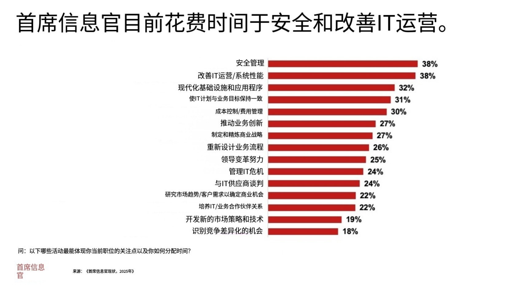 盡管如此,首席信息官們并未放棄職能性和轉(zhuǎn)型性職責(zé)。38%的IT領(lǐng)導(dǎo)者確認(rèn)他們花費(fèi)時(shí)間管理安全和提升IT運(yùn)營(yíng)及系統(tǒng)性能。首席信息官們還致力于繪制基礎(chǔ)設(shè)施和應(yīng)用現(xiàn)代化策略(32%)、確保IT倡議與關(guān)鍵商業(yè)目標(biāo)保持一致(31%)以及重新設(shè)計(jì)業(yè)務(wù)流程(26%)。