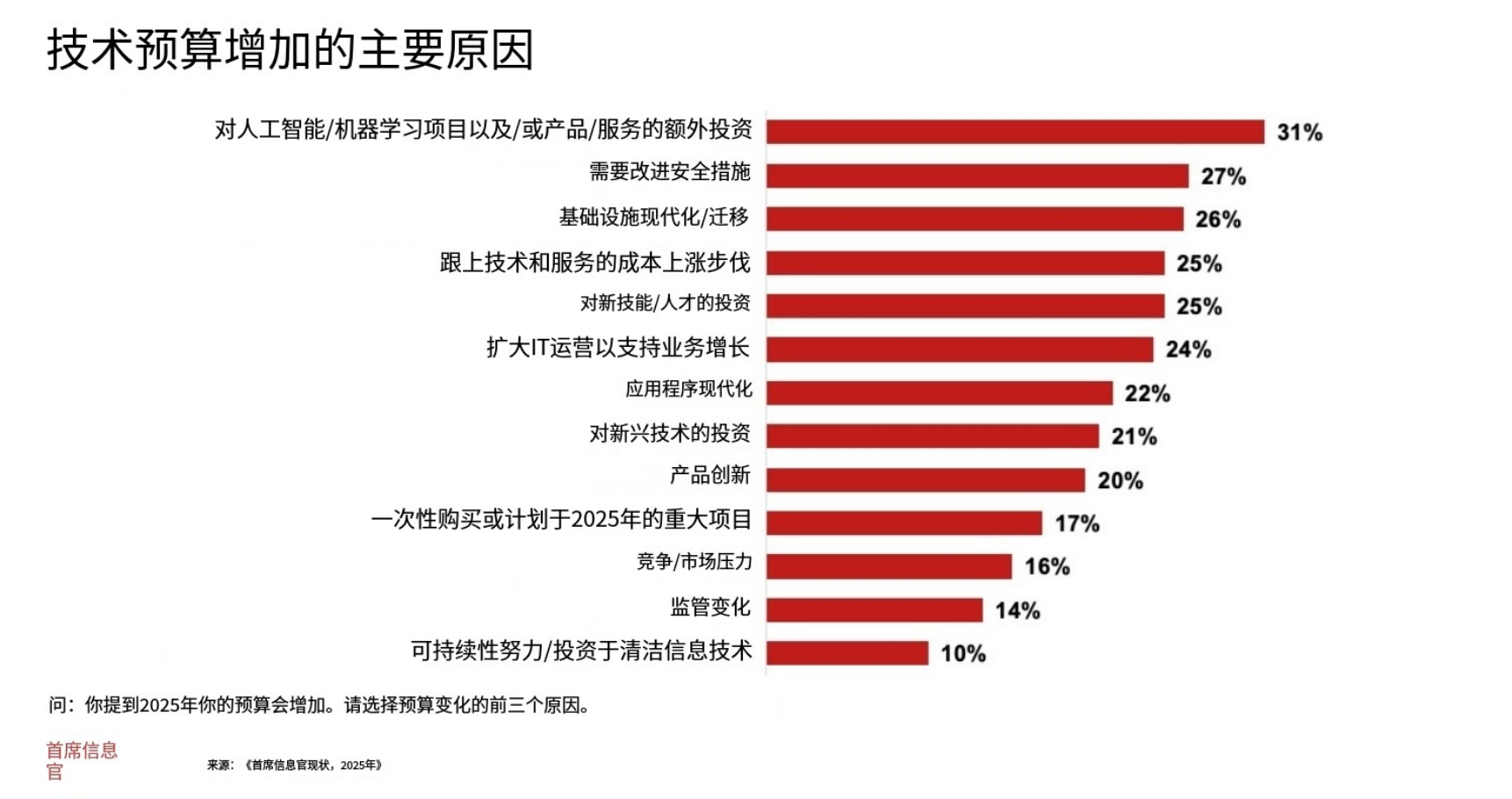 盡管存在全球商業(yè)不確定性,但很少有公司削減技術(shù)投資。2025年首席信息官現(xiàn)狀調(diào)查的65%的受訪者預(yù)計(jì)IT資金將增加,而大約四分之一(24%)的人預(yù)計(jì)資金將保持不變。平均而言,受訪者預(yù)計(jì)2025年IT支出將增加6.9%。那些計(jì)劃增加IT支出的人將增長(zhǎng)歸因于需要加大對(duì)人工智能/機(jī)器學(xué)習(xí)項(xiàng)目、產(chǎn)品和服務(wù)的投資,31%的受訪者提到了這一點(diǎn)。?