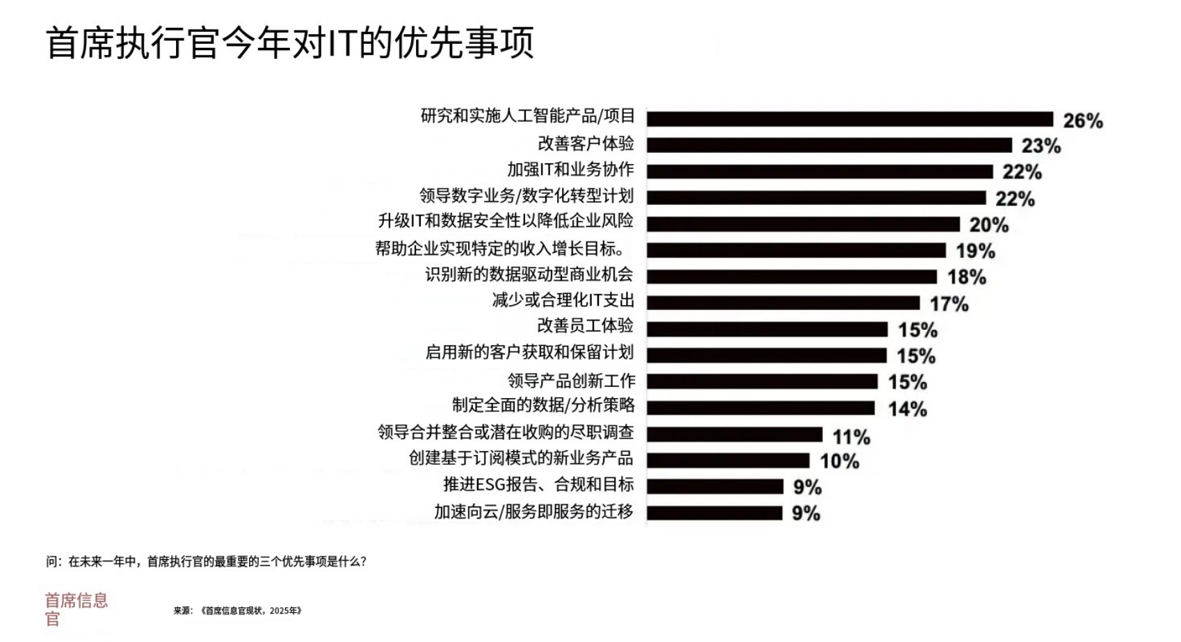 根據(jù)CIO.com的2025年首席信息官現(xiàn)狀調(diào)查,首席執(zhí)行官要求IT部門(mén)研究和實(shí)施人工智能產(chǎn)品及項(xiàng)目是當(dāng)今的頭號(hào)優(yōu)先事項(xiàng)。
