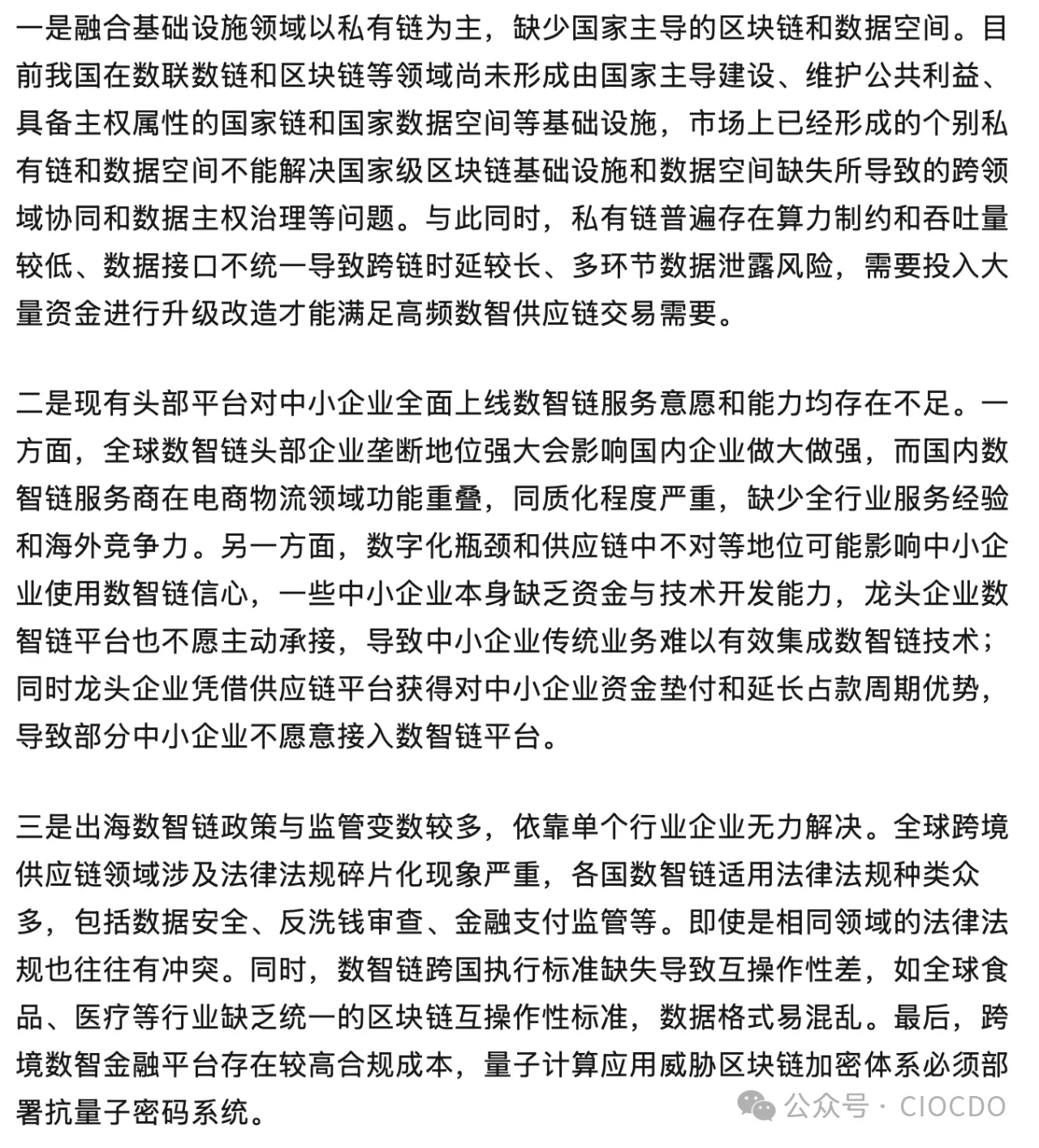 當前,全球數(shù)智鏈供應(yīng)商類型眾多、技術(shù)特點各異,而進一步提升我國數(shù)智鏈能力需要克服多重問題,迫切需要“全壘打”選手。根據(jù)訪談和調(diào)研,目前制約我國數(shù)智鏈能力進一步提升的主要制約因素包括融合基礎(chǔ)設(shè)施不足、中小企業(yè)落地困難和跨國鏈面臨復雜合規(guī)環(huán)境等幾個方面。