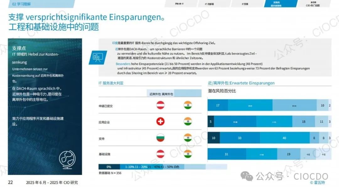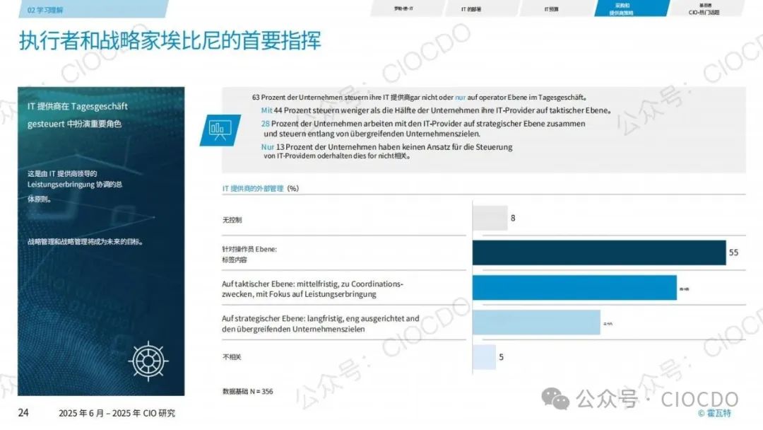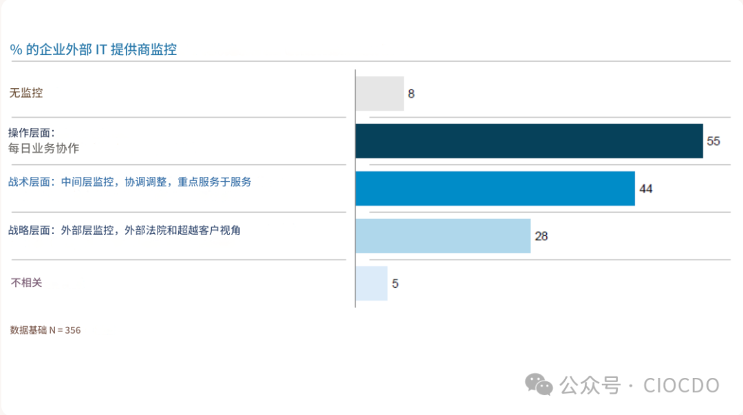 采購(Sourcing)也被用于節(jié)約IT成本。在離岸外包(Offshoring)方面,由于高成本優(yōu)勢,印度在應(yīng)用開發(fā)和基礎(chǔ)設(shè)施領(lǐng)域占據(jù)主導(dǎo)地位。在近岸外包(Nearshoring)方面,由于語言和文化上的接近,奧地利和瑞士等目的地再次成為公司的焦點;在IT支持外包方面,保加利亞正成為一個受歡迎的目的地,此前幾年葡萄牙和西班牙已經(jīng)站穩(wěn)腳跟。然而,只有28%的公司與IT供應(yīng)商在戰(zhàn)略層面進行合作,并圍繞整體企業(yè)目標進行管理。這一點目前發(fā)展不足,必須有針對性地加以建設(shè),以便提升規(guī)模效應(yīng)和更好地控制風險。 只有28%的公司與IT供應(yīng)商在戰(zhàn)略層面進行合作,并圍繞整體企業(yè)目標進行管理。