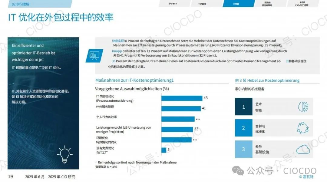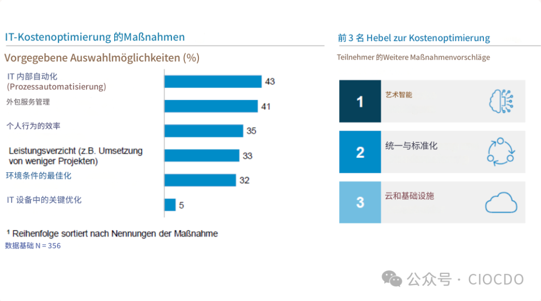 由于預(yù)算壓力增加,IT的優(yōu)先事項正在發(fā)生變化。CIO們不再將重點放在優(yōu)化業(yè)務(wù)上,而是再次更多地關(guān)注效率提升和IT自身的優(yōu)化,例如更新(數(shù)字)IT戰(zhàn)略、自動化活動和IT流程、優(yōu)化所使用的供應(yīng)商或采購條件。財務(wù)控制流程也正在被審視和優(yōu)化。這樣,IT為高效運營和未來的業(yè)務(wù)項目奠定了基礎(chǔ)。