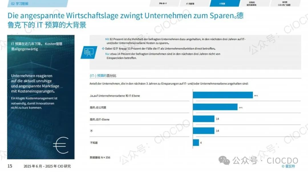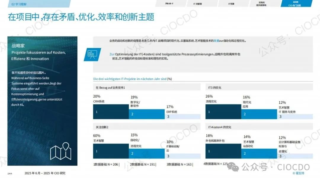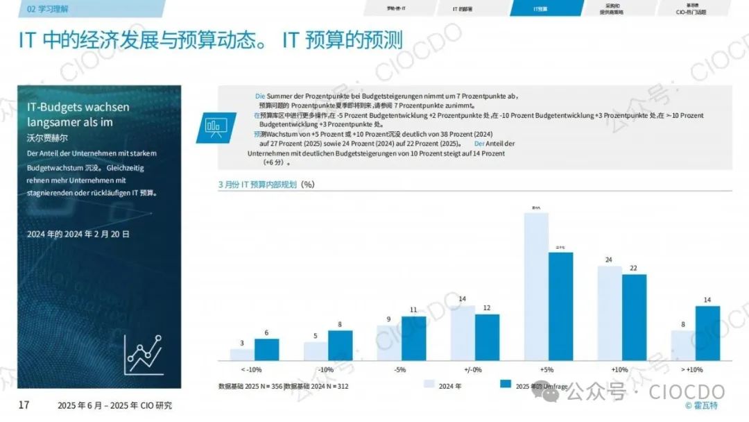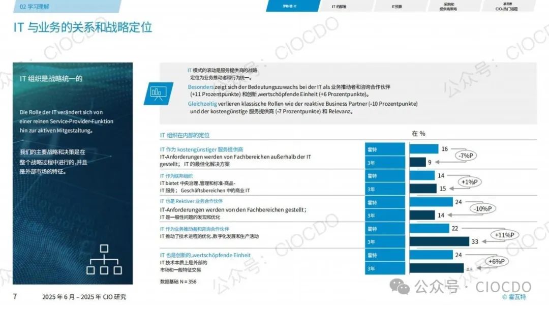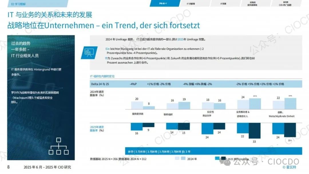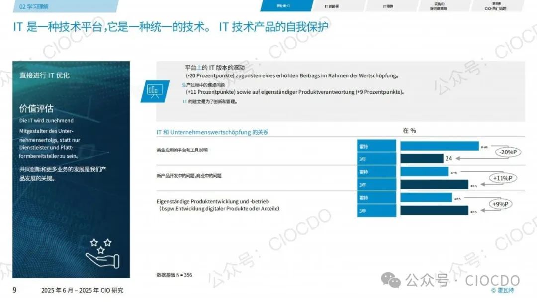 【核心矛盾】Horváth 2025年CIO研究報告揭示了一個核心矛盾:盡管IT的戰(zhàn)略地位日益重要,日益成為業(yè)務(wù)的賦能者和咨詢伙伴,但在當前的經(jīng)濟壓力下,其預(yù)算卻普遍面臨停滯或削減,投資重點也正從外部的“業(yè)務(wù)轉(zhuǎn)型”轉(zhuǎn)向內(nèi)部的“IT運營效率”。