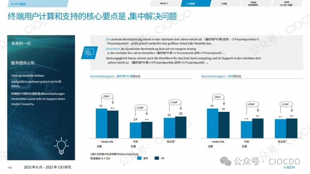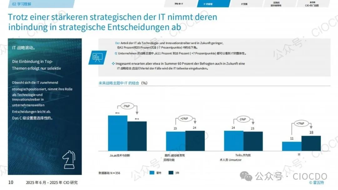 《2025年CIO研究報告》證實了往年研究的一個基本趨勢:IT正日益貼近業(yè)務(wù),并在企業(yè)中扮演著越來越重要的戰(zhàn)略角色。其作為低成本服務(wù)提供者和單純平臺供應(yīng)方的角色逐漸淡化,取而代之的是對業(yè)務(wù)成功的貢獻日益增加。 這一點從其作為業(yè)務(wù)賦能者與咨詢伙伴(+11個百分點)以及創(chuàng)新價值創(chuàng)造單元(+6個百分點)的價值增長中得到證明,這兩項未來將合計占超過60%。具體而言,IT更加專注于產(chǎn)品開發(fā)過程中的咨詢(+11個百分點)以及獨立的產(chǎn)品責任(+9個百分點)。 然而,也存在一個不足之處。盡管IT的角色價值創(chuàng)造能力增強,但目前在全公司范圍的決策中,它作為技術(shù)與創(chuàng)新驅(qū)動者的認知度卻有所下降(-7個百分點)。對此,CIO們可以通過與業(yè)務(wù)部門合作,有針對性地開發(fā)和宣傳創(chuàng)新用例,明確指出IT在哪些領(lǐng)域是創(chuàng)新的賦能者,而不僅僅是技術(shù)提供者,從而進行反制。相應(yīng)地,CIO應(yīng)在最高管理層中更積極地定位自己,例如通過共同負責業(yè)務(wù)計劃或進行價值導(dǎo)向的IT價值貢獻報告。