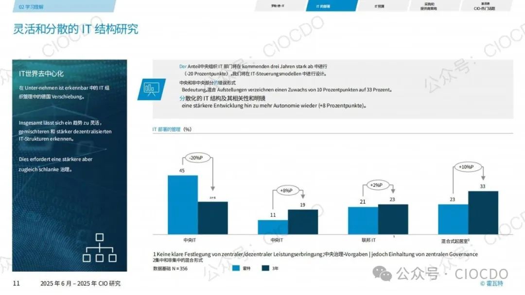 研究的另一個有趣結(jié)果是:未來三年,集中式IT組織的比例將大幅下降(-20個百分點),而中央與去中心化組件相結(jié)合的混合形式將顯著增加。業(yè)務(wù)部門內(nèi)承擔IT活動的去中心化IT結(jié)構(gòu)也在增長。這一向更靈活、更混合、更去中心化的IT組織發(fā)展的趨勢,要求更強的治理。IT必須更好地控制成本,讓業(yè)務(wù)部門更多地參與支出并承擔責任。通過這種方式,IT和業(yè)務(wù)的聯(lián)系將越來越緊密。