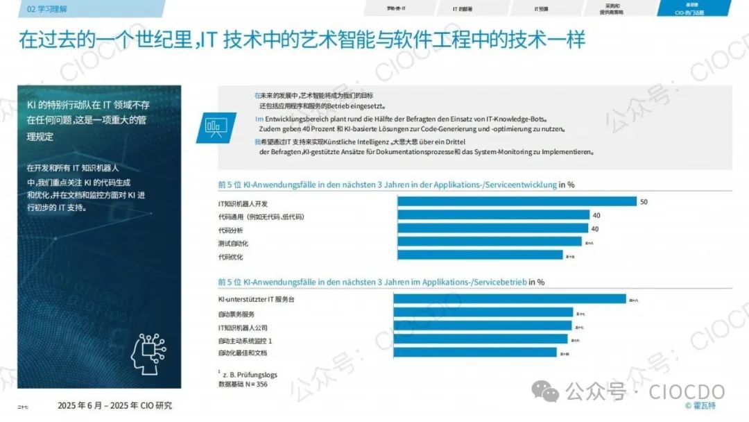 【應(yīng)對策略】為應(yīng)對這一挑戰(zhàn),CIO們正積極采取一系列內(nèi)部優(yōu)化措施,其核心是利用AI來賦能IT自身的開發(fā)(如代碼生成)與運營(如服務(wù)臺自動化),同時調(diào)整采購策略(如外包),并適應(yīng)IT職能向業(yè)務(wù)部門分散的去中心化趨勢,加強治理。