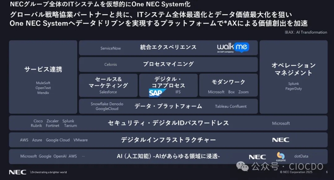 在2019年設(shè)定的“DX議程”中,公司將DX中的“X”視為“X-formation”(轉(zhuǎn)型),致力于將“持續(xù)變革的能力與文化”融入企業(yè)DNA。為推動(dòng)這一目標(biāo),公司確定了九個(gè)“變革驅(qū)動(dòng)力”,包括“敬業(yè)度”、“文化”、“組織與人才”、“全公司標(biāo)準(zhǔn)流程”、“數(shù)字經(jīng)營(yíng)基礎(chǔ)”、“DX愿景”等,并付諸實(shí)施。 在系統(tǒng)方面,公司構(gòu)建了名為OneNEC System的框架,將NEC集團(tuán)擁有的超過(guò)1200個(gè)不同系統(tǒng),虛擬地視為一個(gè)統(tǒng)一系統(tǒng),以實(shí)現(xiàn)整體最優(yōu)化。該框架以基礎(chǔ)設(shè)施、安全、AI等技術(shù)為基石,其上是數(shù)據(jù)平臺(tái),核心流程層有SAP,銷售與市場(chǎng)營(yíng)銷層有Salesforce,生產(chǎn)力工具有Box、Zoom、Microsoft等,此外還部署了用于持續(xù)流程改善的Celonis(流程挖掘),以及整合用戶體驗(yàn)的ServiceNow和WalkMe(數(shù)字采納平臺(tái))。