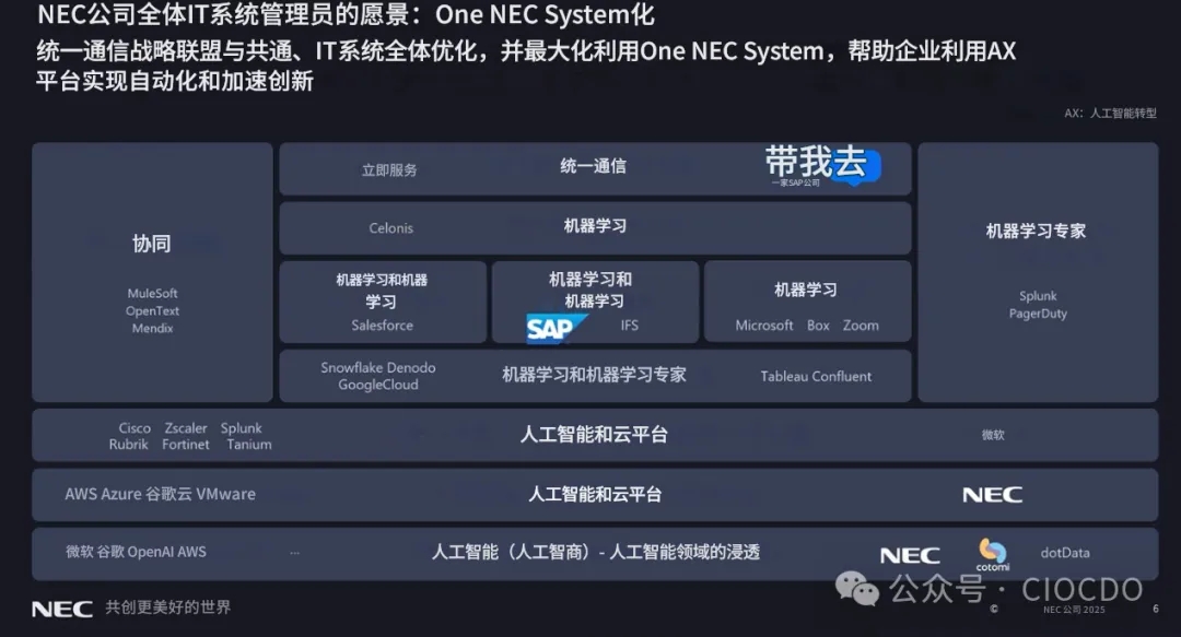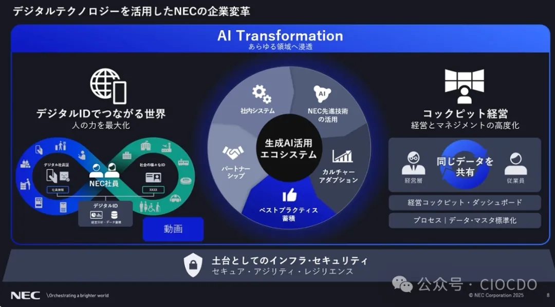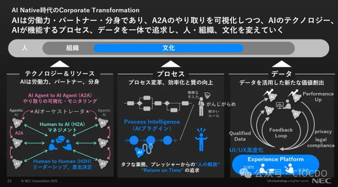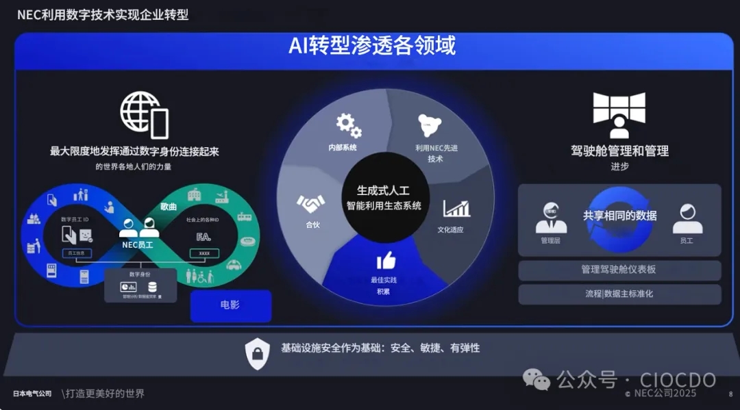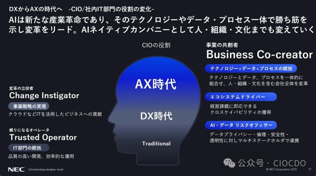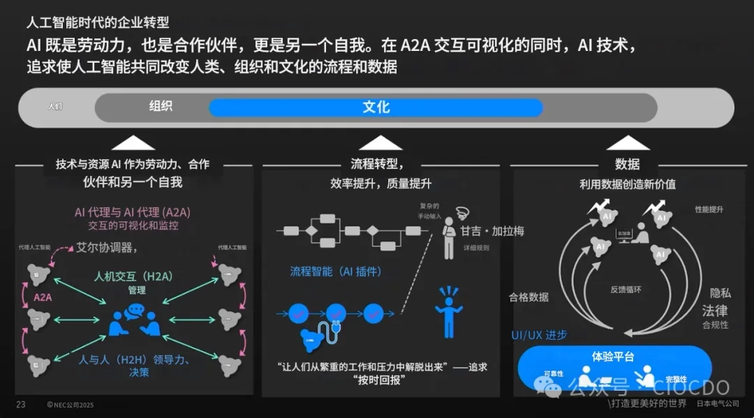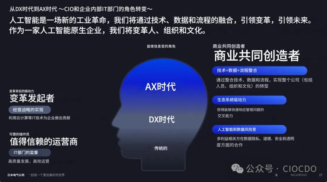 始于經(jīng)營(yíng)危機(jī)的NEC,通過(guò)“客戶零距離”(先內(nèi)部變革,再賦能客戶)戰(zhàn)略成功轉(zhuǎn)型,市值8年增長(zhǎng)8倍。轉(zhuǎn)型圍繞人、數(shù)據(jù)和AI三大支柱,并利用數(shù)字采納平臺(tái)(DAP)優(yōu)化員工體驗(yàn),確保技術(shù)落地。這一實(shí)踐證明,AI時(shí)代的CIO角色正從“變革推動(dòng)者”演變?yōu)椤?/span>業(yè)務(wù)價(jià)值的共同創(chuàng)造者”,需整合技術(shù)、數(shù)據(jù)與流程,與業(yè)務(wù)共同創(chuàng)造未來(lái)。