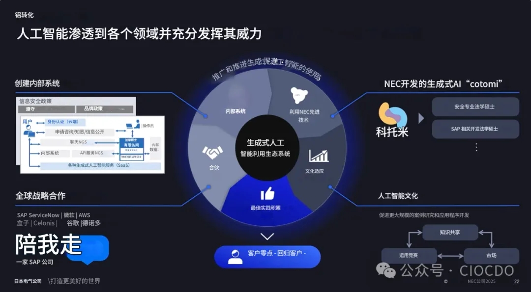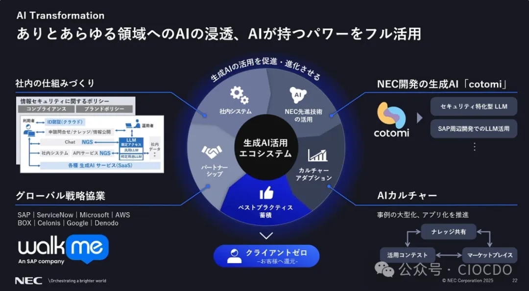 【三大支柱與關(guān)鍵賦能:人、數(shù)據(jù)、AI與體驗(yàn)】NEC的轉(zhuǎn)型圍繞人、數(shù)據(jù)和AI三大支柱展開(kāi)。在“人”的方面,通過(guò)數(shù)字ID等技術(shù),致力于提升員工的辦公與生活體驗(yàn),因?yàn)轶w驗(yàn)是確保技術(shù)被采納的關(guān)鍵;在“數(shù)據(jù)”方面,通過(guò)構(gòu)建“經(jīng)營(yíng)駕駛艙”等可視化工具,將數(shù)據(jù)從“對(duì)過(guò)去的追責(zé)”轉(zhuǎn)變?yōu)椤皩?duì)未來(lái)的行動(dòng)”,賦能各級(jí)員工進(jìn)行數(shù)據(jù)驅(qū)動(dòng)的決策;在“AI”方面,則全面擁抱生成式AI,構(gòu)建以自家模型“cotomi”為核心的生態(tài)系統(tǒng)。在這一過(guò)程中,一個(gè)重要的成功秘訣是利用數(shù)字采納平臺(tái)(DAP)等工具。通過(guò)在SAP等復(fù)雜系統(tǒng)之上疊加操作引導(dǎo),NEC極大地改善了用戶體驗(yàn),顯著降低了操作失誤和培訓(xùn)成本,確保了新技術(shù)的有效落地與扎根。