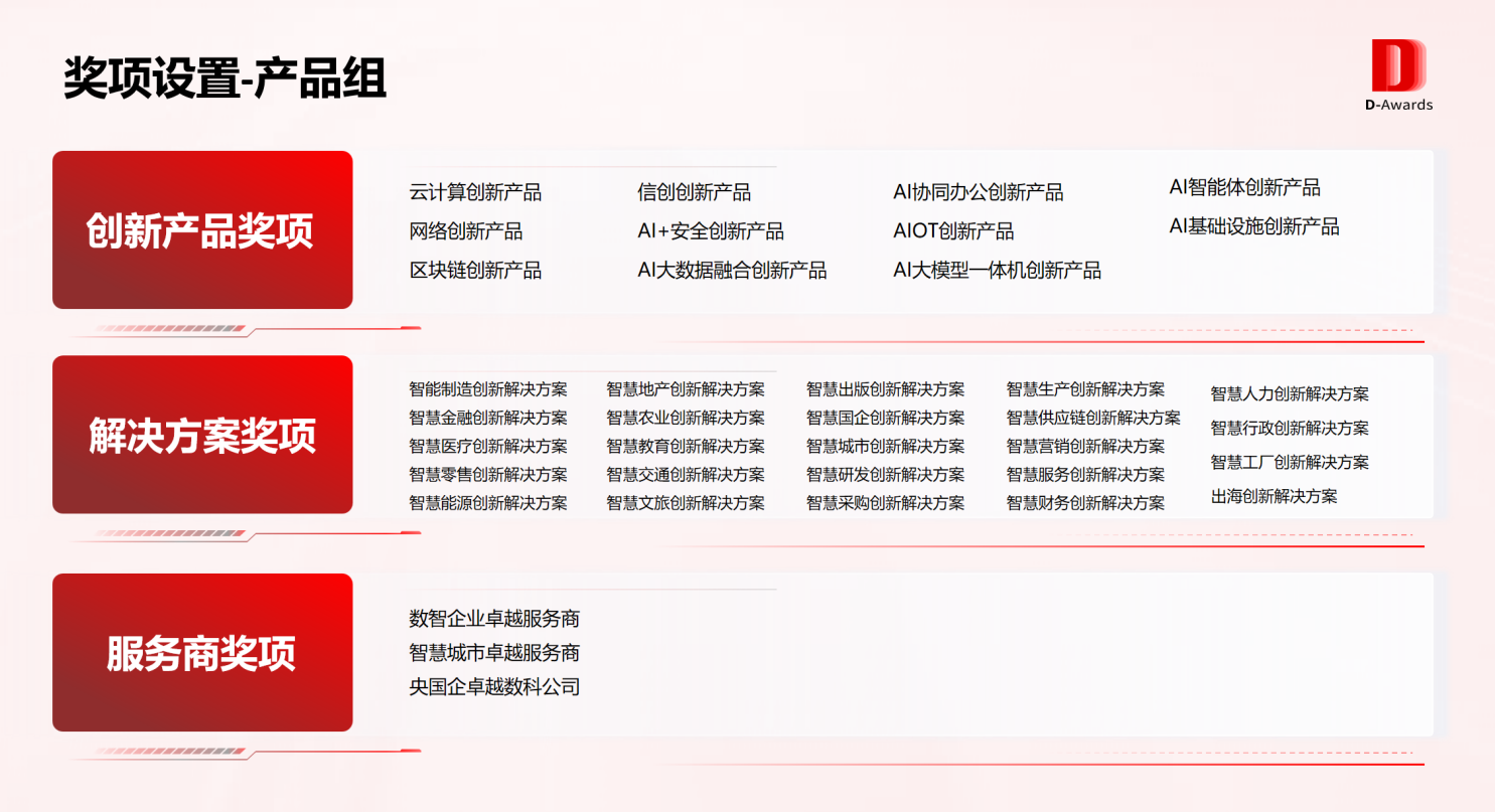 產(chǎn)品組獎(jiǎng)項(xiàng)緊跟技術(shù)趨勢(shì),聚焦AI 核心能力,設(shè)置 AI協(xié)同辦公產(chǎn)品、AI智能體創(chuàng)新產(chǎn)品、AI 大模型一體機(jī)創(chuàng)新產(chǎn)品、AI大數(shù)據(jù)融合創(chuàng)新產(chǎn)品等特色產(chǎn)品獎(jiǎng)項(xiàng),同時(shí)覆蓋智能制造、智慧金融、智慧醫(yī)療、智慧供應(yīng)鏈等全場(chǎng)景解決方案,更設(shè)置數(shù)智企業(yè)卓越服務(wù)商、智慧城市卓越服務(wù)商等榮譽(yù),從產(chǎn)品創(chuàng)新到服務(wù)能力,多維度認(rèn)可企業(yè)技術(shù)實(shí)力。