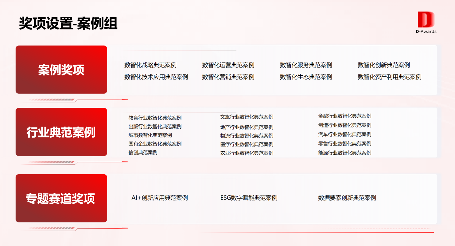 案例組獎(jiǎng)項(xiàng)升級(jí)后,既保留數(shù)智化戰(zhàn)略、技術(shù)應(yīng)用、運(yùn)營(yíng)、營(yíng)銷等全流程核心賽道,又細(xì)分出制造、醫(yī)療、金融、能源等行業(yè)典范案例,還新增AI + 創(chuàng)新應(yīng)用、ESG?數(shù)字賦能、數(shù)據(jù)要素創(chuàng)新等前沿專題賽道,無論您是行業(yè)巨頭還是行業(yè)新秀,都能找到專屬展示舞臺(tái),全方位呈現(xiàn)數(shù)智轉(zhuǎn)型成果。