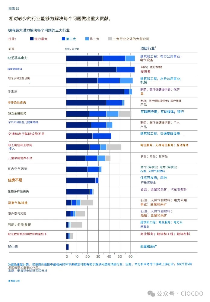 高度專業(yè)化:解決任何一個(gè)社會(huì)議題,其能力都高度集中在少數(shù)幾個(gè)行業(yè)。例如,解決“基本電力普及”問(wèn)題,建筑工程、電力和電氣設(shè)備行業(yè)能貢獻(xiàn)絕大部分力量。