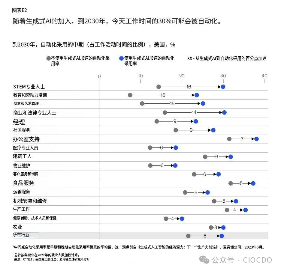 自動(dòng)化進(jìn)程加速 (Exhibit E2):如果沒有生成式AI,預(yù)計(jì)到2030年自動(dòng)化將影響21.5%的工作時(shí)長(zhǎng) 。有了生成式AI,這一數(shù)字躍升至29.5%。對(duì)STEM、教育、創(chuàng)意、法律等知識(shí)型工作的自動(dòng)化加速最為顯著(加速超過(guò)10個(gè)百分點(diǎn)) 。