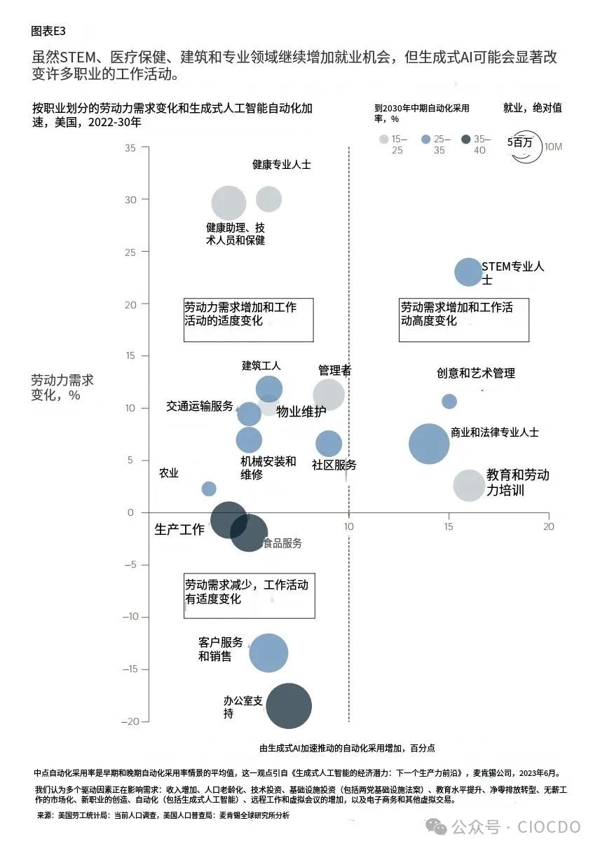 請(qǐng)看這張圖,縱軸代表了到2030年,各個(gè)職業(yè)的‘勞動(dòng)力需求變化’——是增長(zhǎng)還是萎縮?而橫軸則揭示了生成式AI將對(duì)這個(gè)職業(yè)的‘工作模式帶來(lái)多大的改變’。