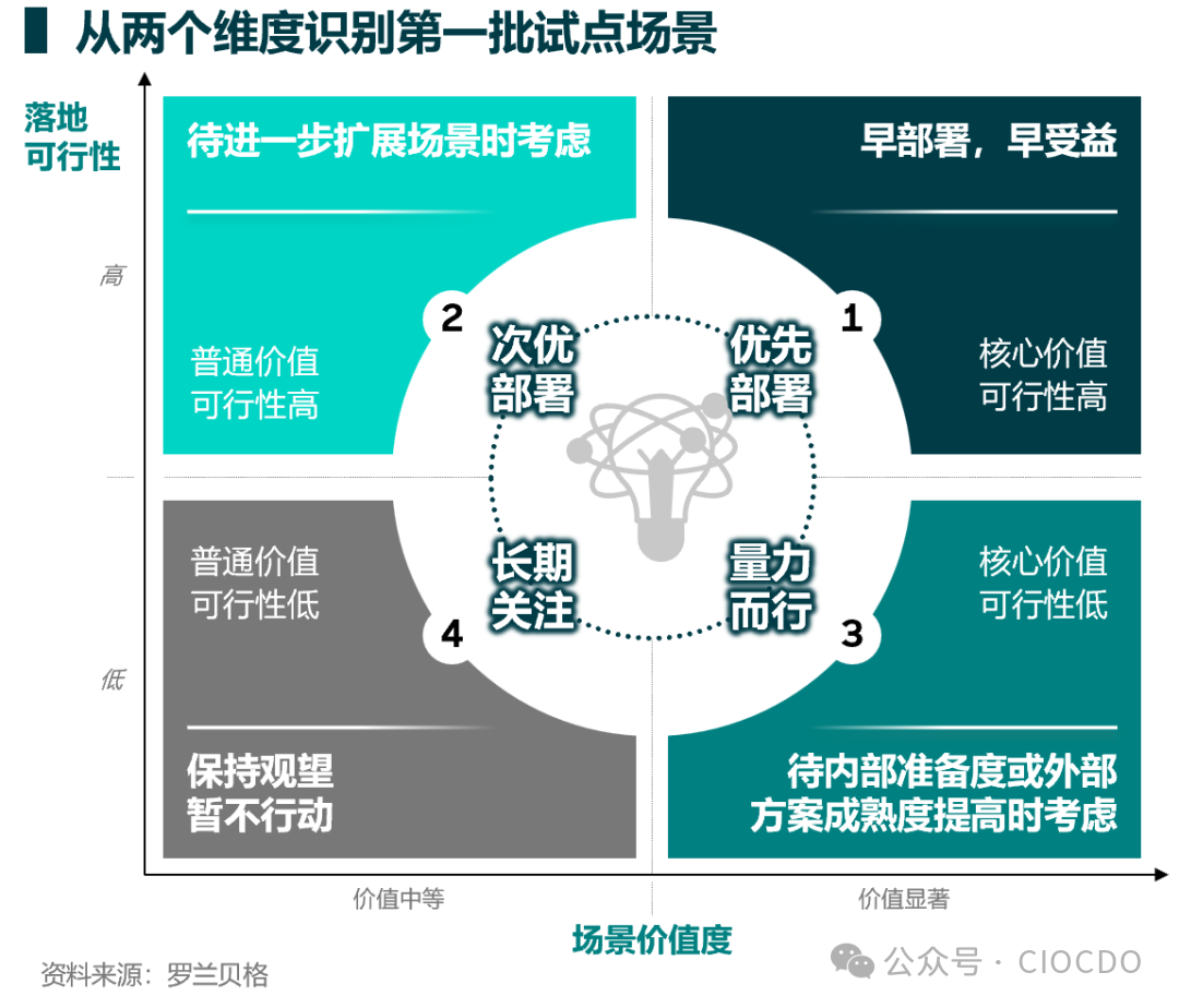 報(bào)告中引用了羅蘭貝格的“AI應(yīng)用場(chǎng)景評(píng)估矩陣”(本文第一張圖),這是一個(gè)非常實(shí)用的決策工具。它通過(guò)“商業(yè)價(jià)值”和“實(shí)現(xiàn)難度”兩個(gè)維度,幫助企業(yè)將紛繁復(fù)雜的AI需求進(jìn)行有效排序,確保資源能精準(zhǔn)投向“早部署早受益”的高價(jià)值區(qū)域,避免在低價(jià)值或高風(fēng)險(xiǎn)項(xiàng)目中空耗。