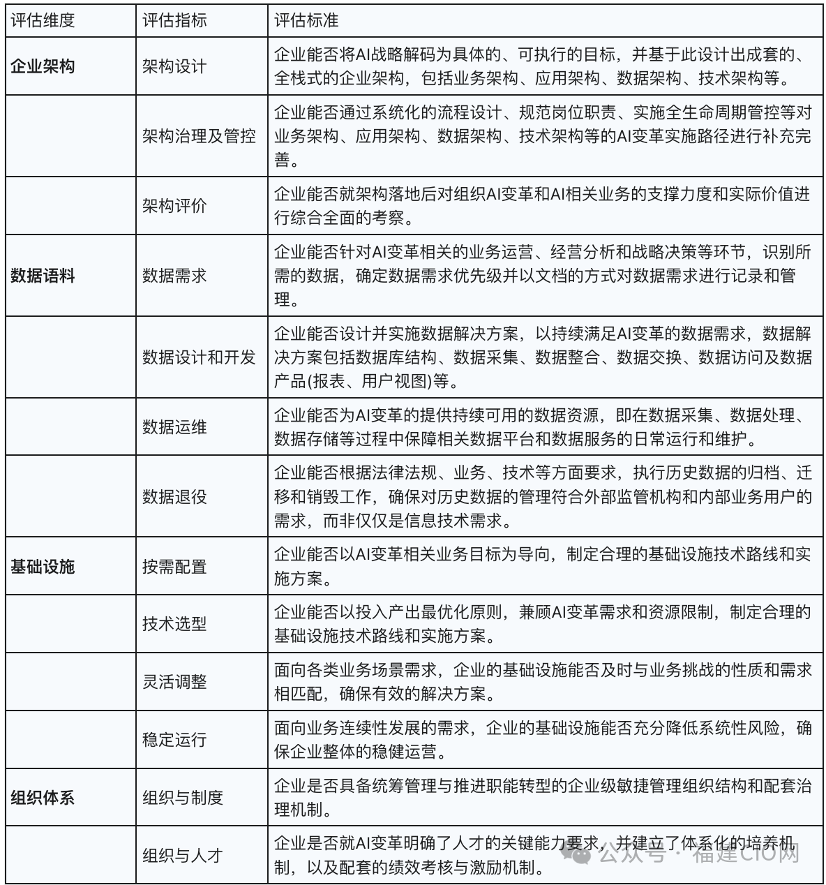 組織體系 (Organization & People):這是最容易被忽視,卻也最關(guān)鍵的一環(huán)。它評(píng)估的是企業(yè)的組織架構(gòu)、人才儲(chǔ)備、激勵(lì)機(jī)制和創(chuàng)新文化。缺乏與AI發(fā)展相匹配的組織結(jié)構(gòu)和文化,即使技術(shù)再先進(jìn),也會(huì)被部門墻、舊流程和人才瓶頸所扼殺。