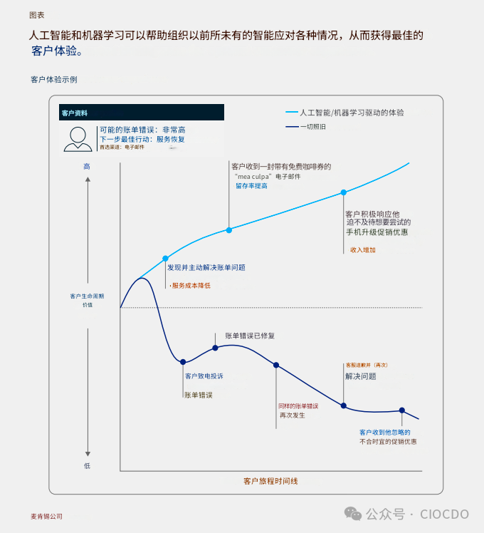 圖表解讀:報(bào)告中的這張圖(原報(bào)告第3頁)以一位客戶的旅程為例。在“傳統(tǒng)模式”(Business as usual)下,客戶遇到賬單錯(cuò)誤,反復(fù)投訴才得以解決,體驗(yàn)糟糕,客戶終身價(jià)值(CLTV)一路下滑。而在“AI驅(qū)動(dòng)的體驗(yàn)”下,系統(tǒng)主動(dòng)識(shí)別并解決了賬單問題,甚至發(fā)送了一張咖啡券作為補(bǔ)償,客戶的滿意度和價(jià)值持續(xù)走高,最終還愉快地接受了產(chǎn)品升級推薦。?
