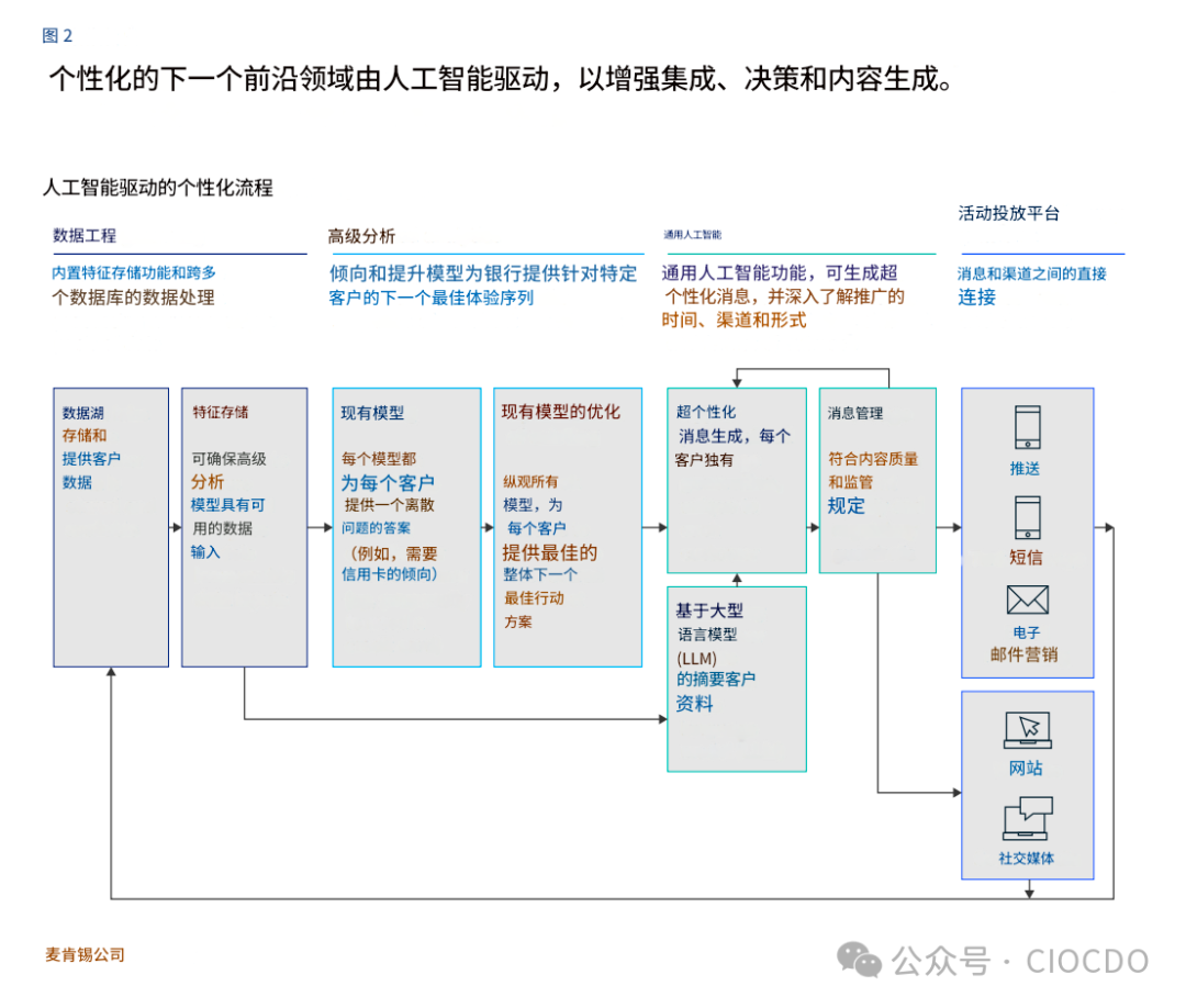 圖表解讀:從左到右,整個(gè)流程一目了然。數(shù)據(jù)被整合處理,分析模型做出決策,生成式AI創(chuàng)作個(gè)性化信息,最后通過交付平臺(tái)觸達(dá)客戶,形成一個(gè)高效的閉環(huán)。?