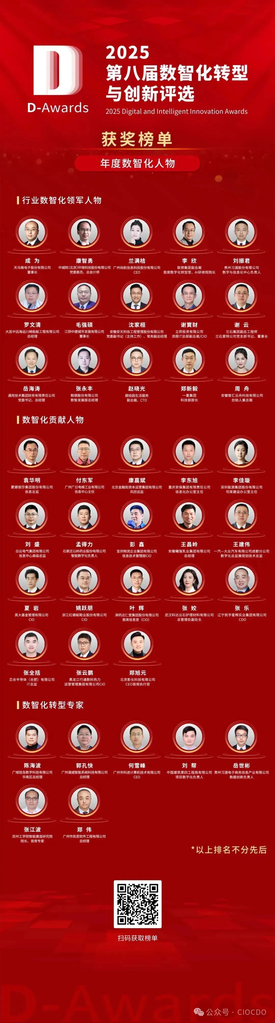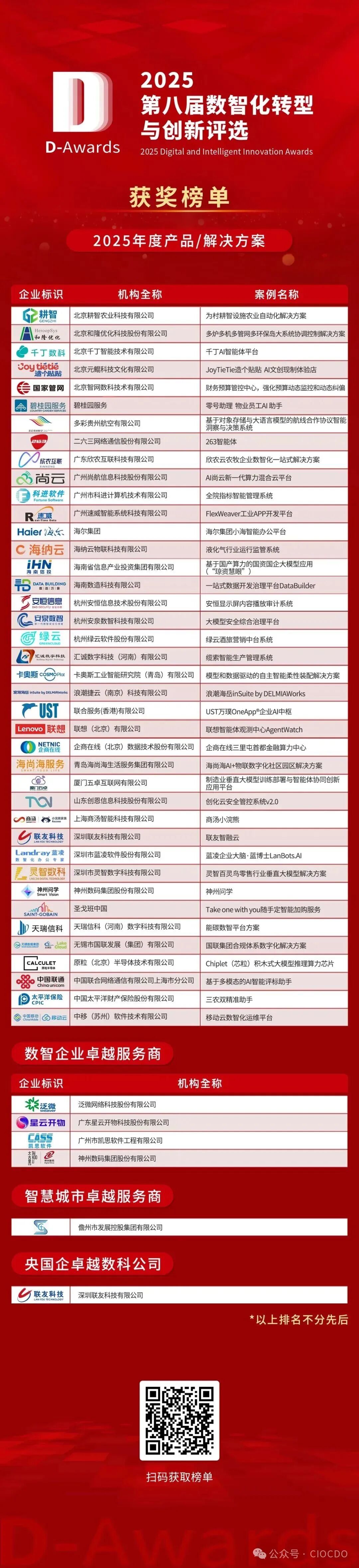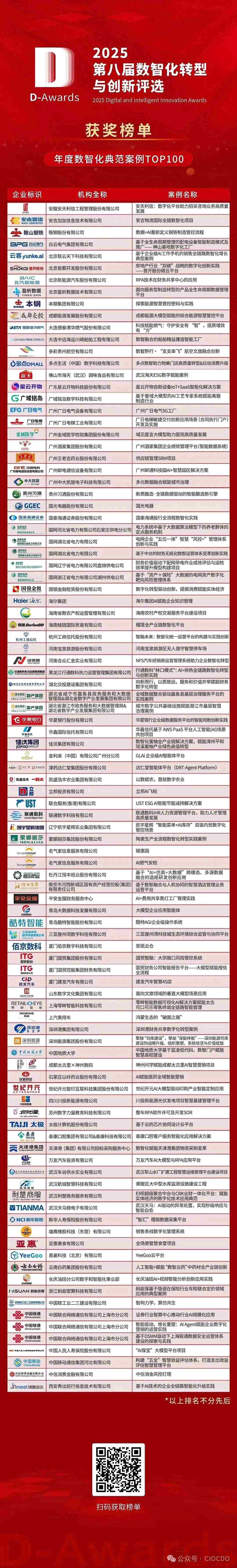 11月27日,“2025第八屆數智化轉型與創(chuàng)新評選”頒獎典禮于北京成功舉辦,數百家獲獎企業(yè)代表與業(yè)界精英共襄盛舉,共同見證數智化轉型的輝煌成果,并正式揭曉了獲獎榜單! 圖1:嘉賓合影 在此次頒獎典禮上,山西大學自動化與軟件學院副院長郭威,中國海洋大學管理學院教授、博士王艦分別發(fā)表致辭。隨后,數字產業(yè)創(chuàng)新研究中心秘書長、錦囊專家創(chuàng)始人李圓介紹了本屆評選活動的整體情況,并重磅發(fā)布《2025中國企業(yè)數智化轉型案例研究報告》。 作為中國首個全面覆蓋數字化產業(yè)和產業(yè)數字化發(fā)展的評選活動,“數智化轉型與創(chuàng)新評選”由數字產業(yè)創(chuàng)新研究中心、錦囊專家、首席數字官聯合全國30多家CIO組織機構、行業(yè)協會共同發(fā)起,已連續(xù)成功舉辦八屆,累計參評企業(yè)超過1萬家,涉及1.1萬余個項目,50個領域。回顧八屆評選的發(fā)展軌跡,我們能清晰看到中國企業(yè)數智化轉型的蓬勃態(tài)勢:從 2018 年 600 余家參評企業(yè)、18 個細分獎項,到 2025 年參評企業(yè)超 1900 家、細分獎項增至 69 個。參評規(guī)模的持續(xù)擴大、覆蓋范圍的不斷延伸、獎項設置的逐步細化,不僅體現了評選的行業(yè)影響力逐年提升,更印證了數智化轉型已從“可選”變?yōu)椤氨剡x”,成為全行業(yè)的共識與行動。 “2025第八屆數智化轉型與創(chuàng)新評選”自5月正式啟動,歷時近半年,以“公平、公正、公開”為原則,以“成熟度、創(chuàng)新性、應用成效、難度和復雜性、推廣性”綜合制定評審標準,由29位數字化領域知名專家學者,對入圍企業(yè)進行多維度的評審和考核,并綜合公眾投票的結果,最終有159家企業(yè)和個人脫穎而出,榮膺各項大獎。 本屆評選活動以中國數字企業(yè)模型與指標體系、智慧城市評價指標體系2.0為理論指導,面向企事業(yè)單位、政府,設置了案例組、產品組和人物組三大組別的69個細分獎項,參與企業(yè)數目超過1900家。經過嚴格的四輪評審,最終產生了100個標桿案例、一批創(chuàng)新產品和40位數字化先鋒人物。他們來自全國21個省份、13個主要行業(yè),充分體現了數智化轉型的廣度與深度。其中,案例組獲獎企業(yè)以信息技術服務業(yè)、制造業(yè)相對居多,企業(yè)類型以國有企業(yè)和民營企業(yè)為主。產品組獲獎企業(yè)涉及AI+安全、AI大數據融合、AI基礎設施、AI協同辦公、AI智能體、云計算等6大創(chuàng)新產品,制造、教育、金融、零售、能源、農業(yè)等9大行業(yè),以及采購、研發(fā)、營銷、服務等4大場景。人物組獲獎者主要為大中型企業(yè)CEO、CIO等數智化轉型決策者。 圖2:評委會專家致辭 圖3:福建省職業(yè)經理人協會副會長兼CIO與CDO專委會主任、福建CIO網創(chuàng)始人 謝磊為年度數智化典范案例獲獎嘉賓頒獎 圖4:年度數智化典范案例頒獎嘉賓與獲獎嘉賓合影 以下為本屆完整獲獎榜單,恭喜所有獲獎者!“2026第九屆數智化轉型與創(chuàng)新評選”預計將于2026年6月正式啟動,歡迎數字化領域的各界組織機構及相關人士,一起凝聚數字化力量,助力中國數字經濟創(chuàng)新發(fā)展。