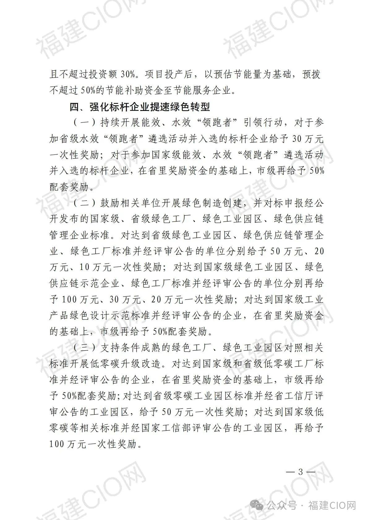 (一)持續(xù)開展能效、水效“領(lǐng)跑者”引領(lǐng)行動,對于參加省級水效“領(lǐng)跑者”遴選活動并入選的標(biāo)桿企業(yè)給予30萬元一次性獎勵;對于參加國家級能效、水效“領(lǐng)跑者”遴選活動并入選的標(biāo)桿企業(yè),在省里獎勵資金的基礎(chǔ)上,市級再給予50%配套獎勵。